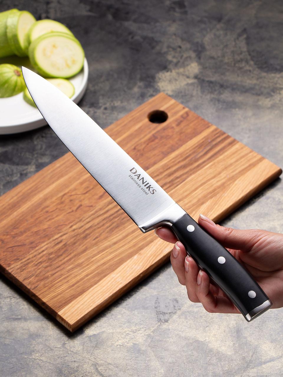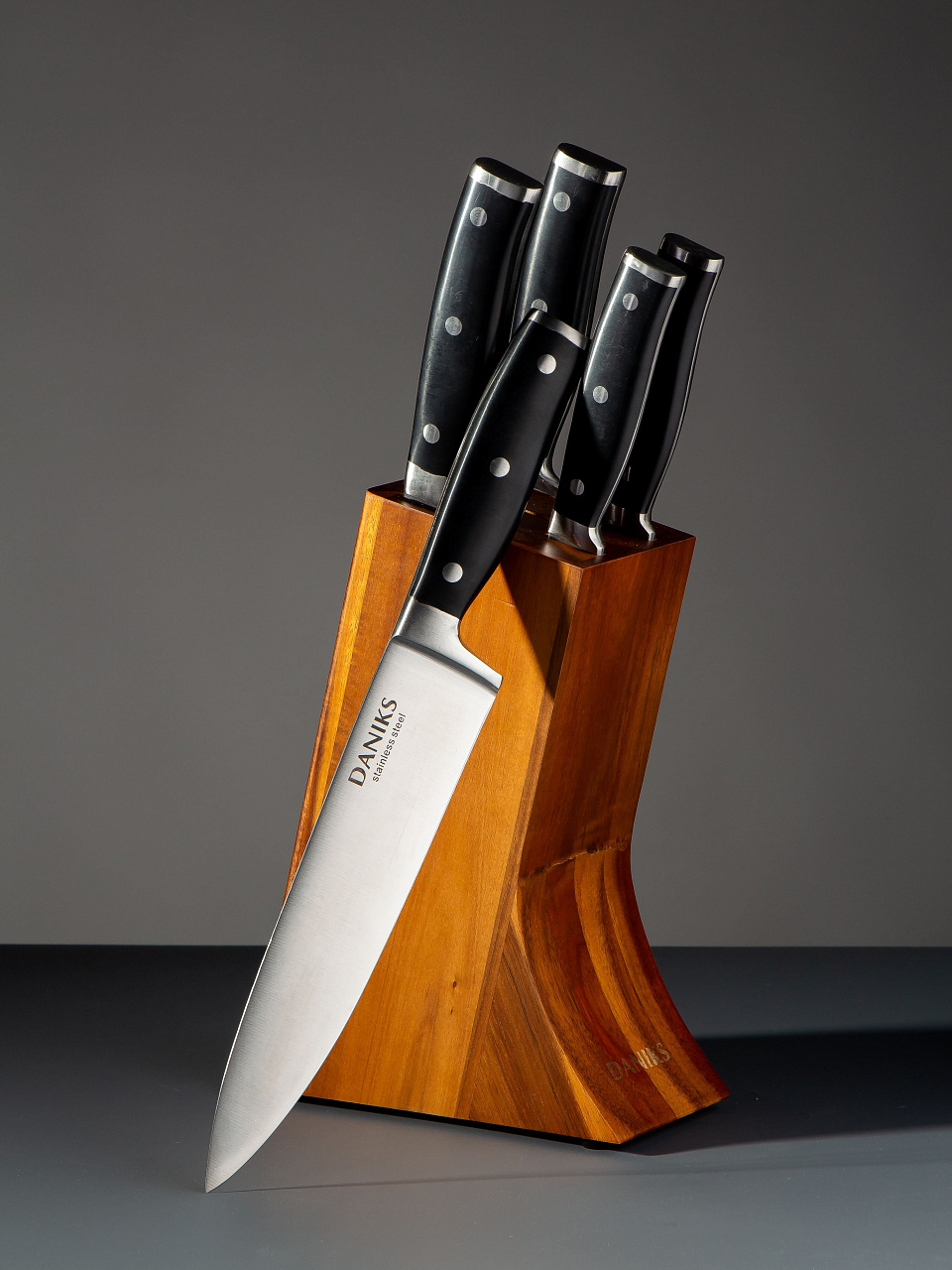 Эффектная деревянная подставка не только украсит рабочую зону, но и обеспечит безопасное хранение ножей, защищая лезвия от повреждений. Лаконичный черный цвет коллекции Daniks Black станет гармоничным акцентом на любой кухне, подчеркивая современный стиль и практичность. Все ножи можно мыть в посудомоечной машине, что значительно облегчает уход за комплектом и экономит время.