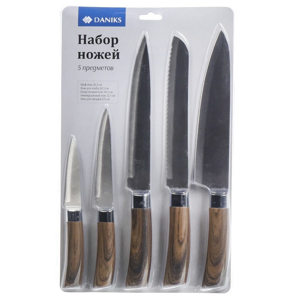 Ищете стильные и надежные ножи для кухни? Набор ножей 5 предметов Daniks Style Y4-8915 станет отличным выбором для создания кулинарных шедевров. Современный дизайн, коричневая эргономичная рукоятка и прочная нержавеющая сталь делают этот комплект незаменимым помощником на кухне. Практичность и универсальность набора позволяют с легкостью справляться с любыми задачами: от нарезки овощей до разделки мяса и хлеба. Благодаря компактной упаковке на блистере комплект удобно хранить или брать с собой на дачу.