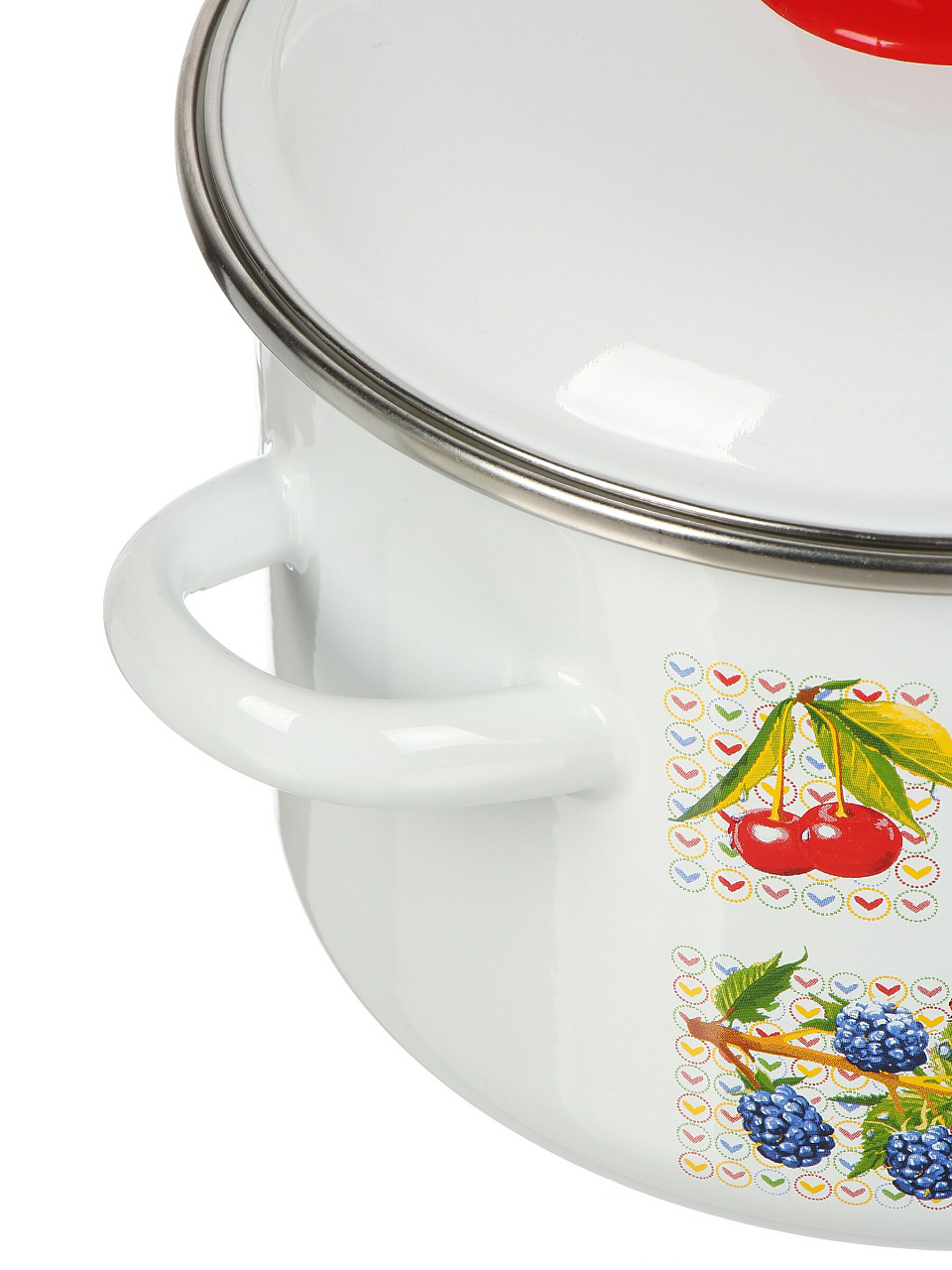 - Эстетика и универсальность: белая эмалированная сталь с ярким дизайном «Вкус лета» подходит для всех типов плит, включая индукционные.