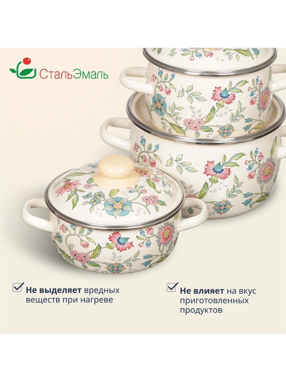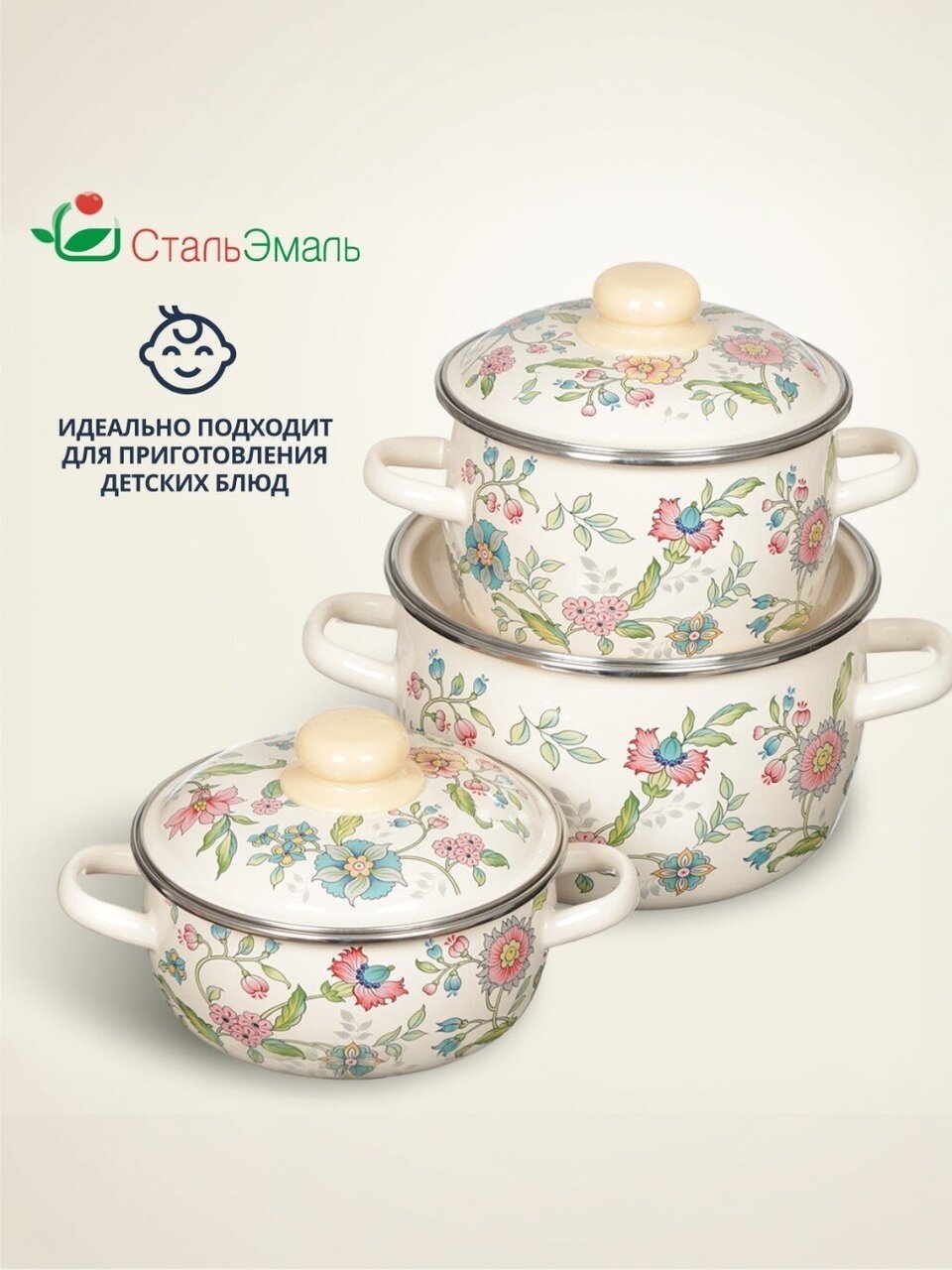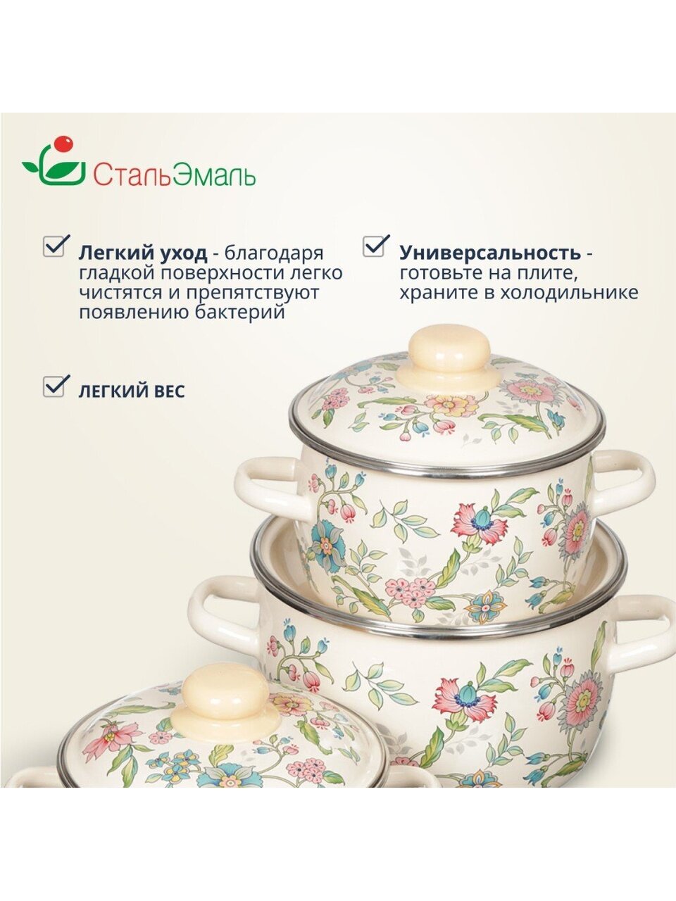 Набор посуды из эмалированной стали «Луговые цветы» бренда СтальЭмаль — это оптимальный выбор для тех, кто ищет, какую кастрюлю купить для индукционной плиты или как выбрать посуду для дачи. Благодаря универсальным объёмам (1,5, 2 и 4 литра) и совместимости с газовыми, электрическими, стеклокерамическими и индукционными плитами, этот комплект решает задачи любой кухни. Эмалированная поверхность не впитывает запахи, устойчива к царапинам и легко очищается — это особенно важно для семей с детьми или для частого использования.