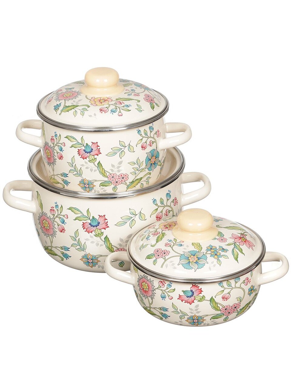 Набор кастрюль из эмалированной стали «Луговые цветы» 6 предметов: универсальное решение для дома, дачи и подарка — подходит для индукции и всех типов плит.