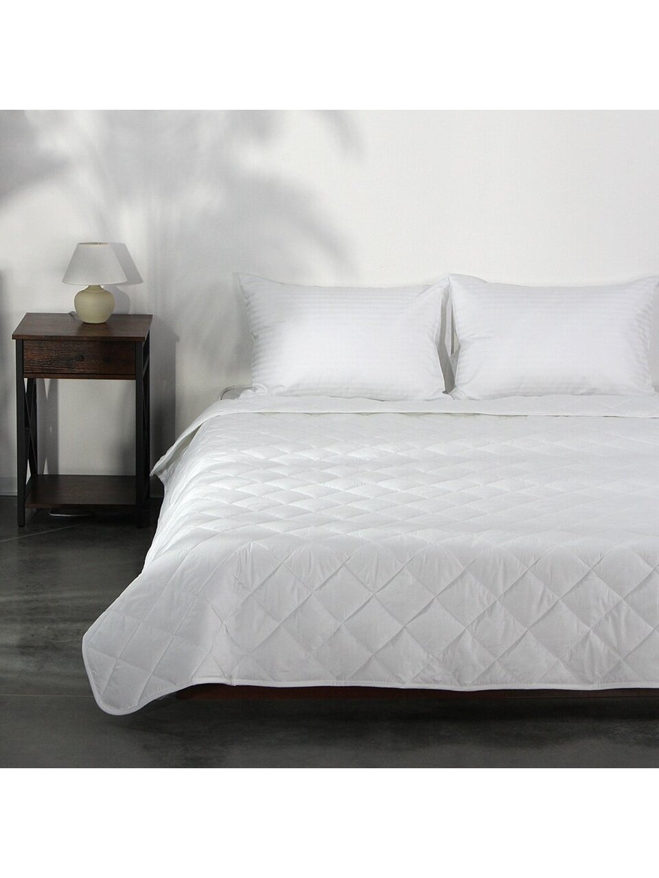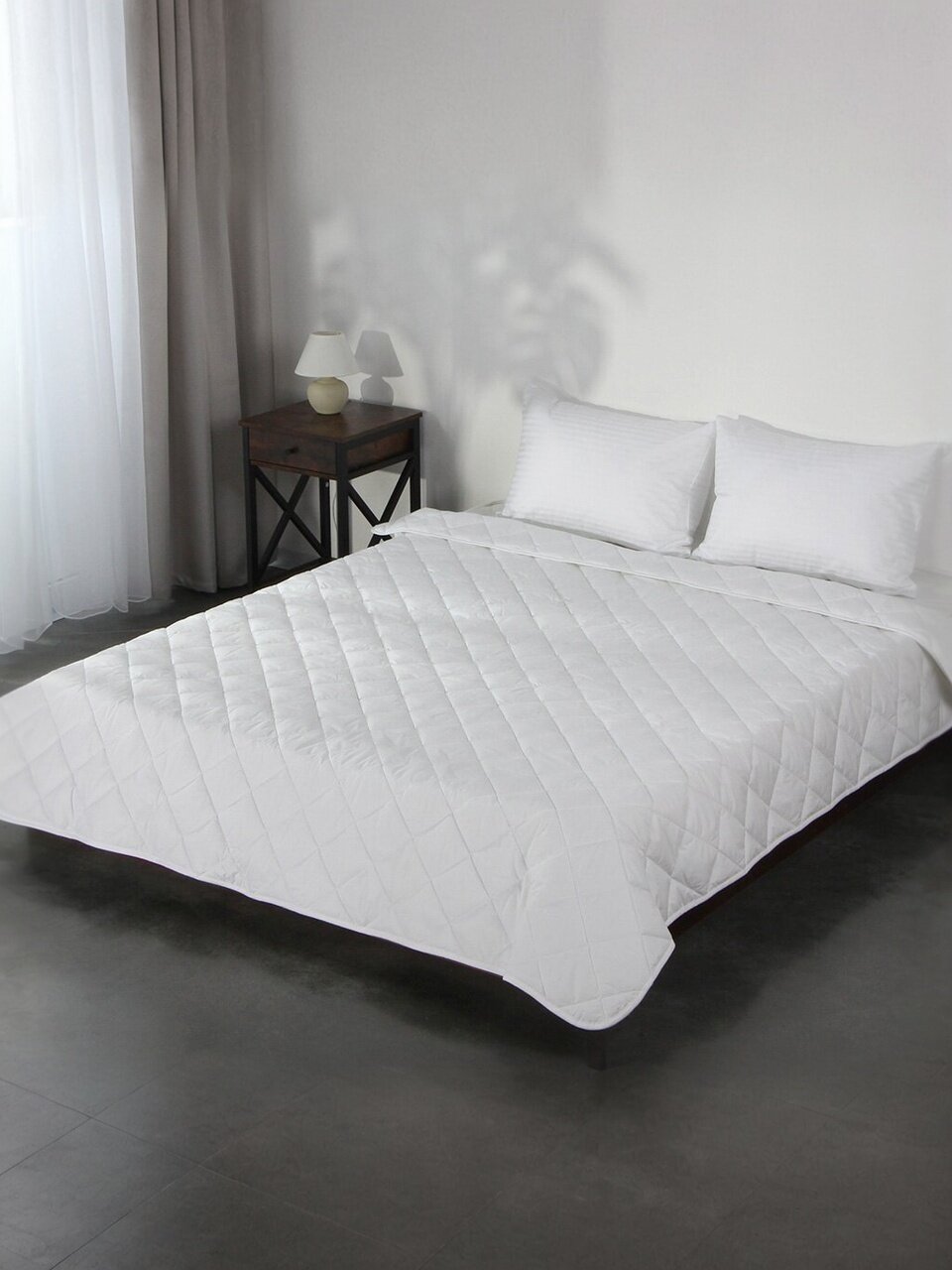 Размер 172х205 см — оптимально для большинства двуспальных кроватей, не сползает, легко заправлять.