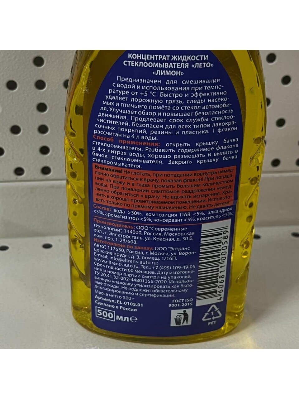 Вы можете приобрести «Омыватель стекол Eltrans, Лимон, летний, 1 °C, 0.5 л, концентрат 1:8, EL-0105.01» и другие товары в нашем интернет-магазине в Железногорске по низким ценам и с бесплатным самовывозом.