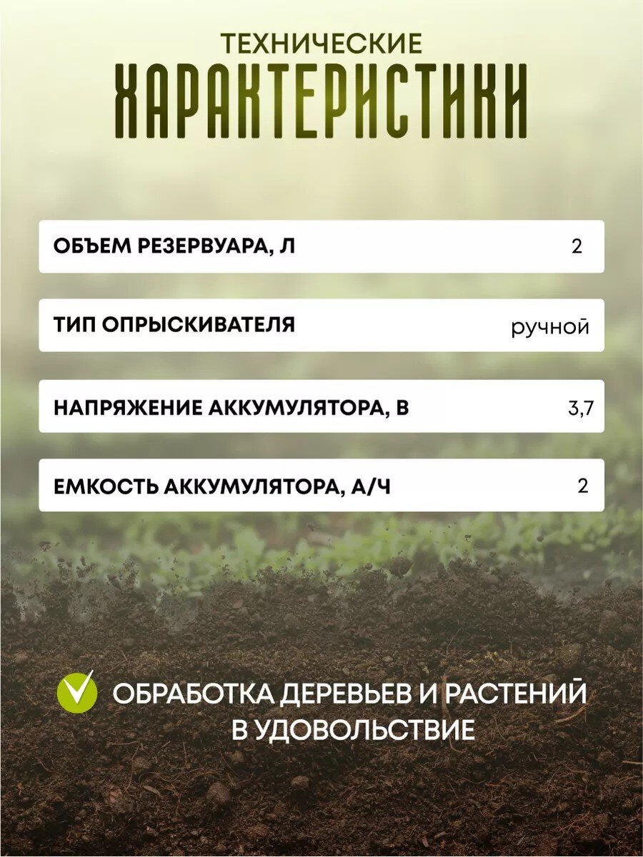 Опрыскиватель можно использовать в любом месте без необходимости подключения к электрической сети. Это особенно удобно для обработки удаленных участков сада или огорода, где нет доступа к розеткам.