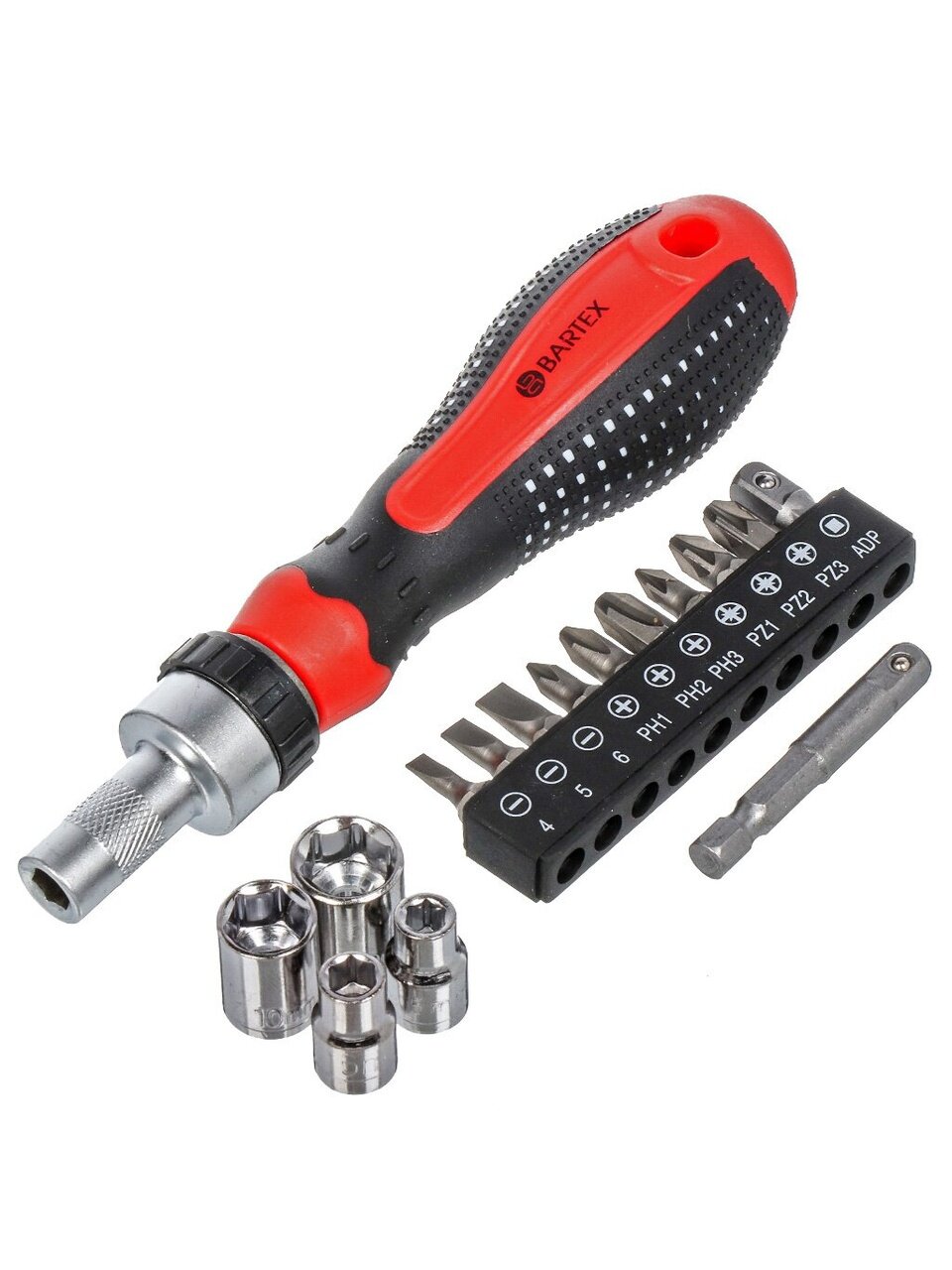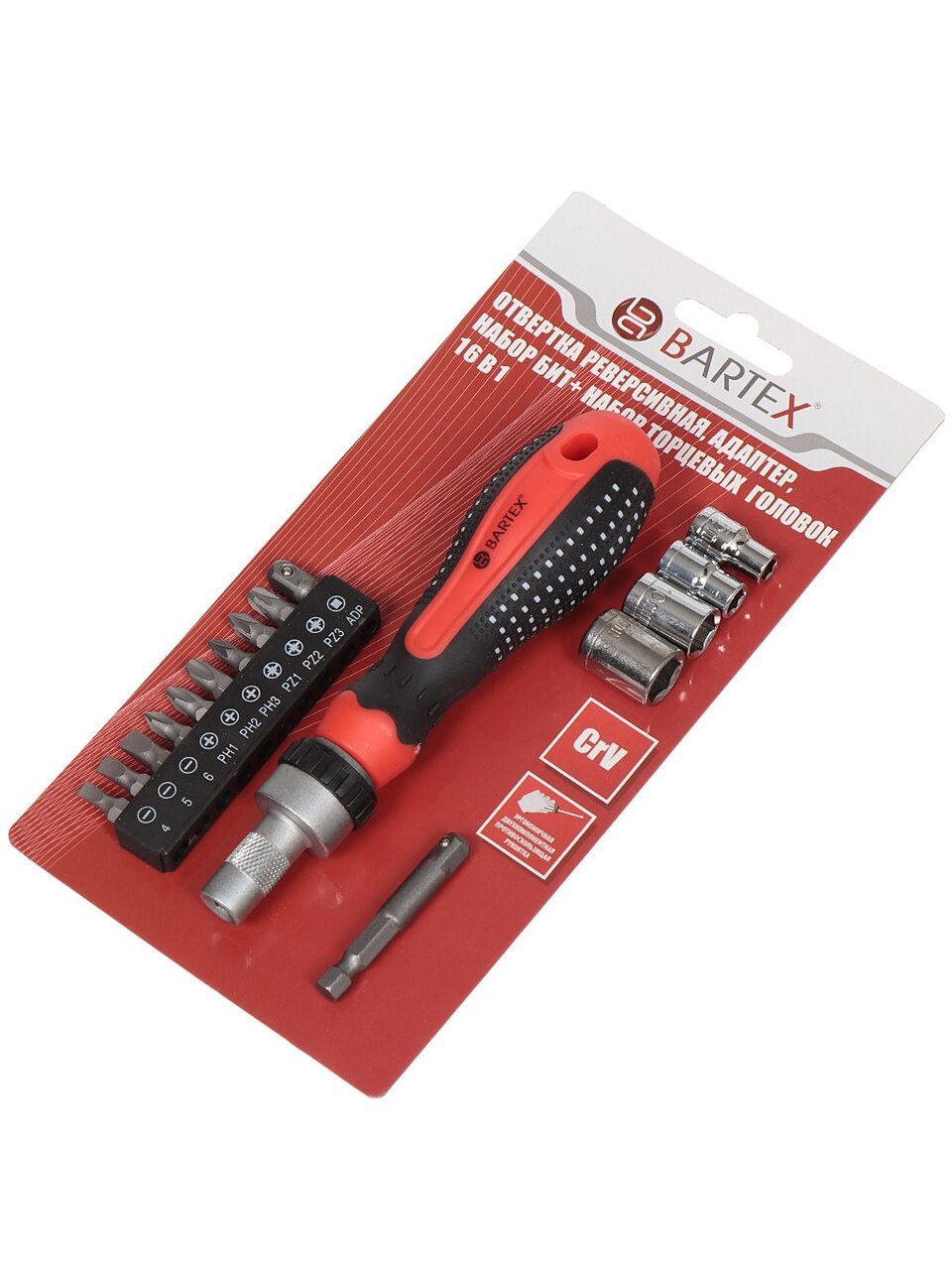 Реверсивная отвертка с битами Bartex — универсальный инструмент для дома и дачи. Комплект из 16 предметов, включая плоские, крестовые и торцевые насадки, идеально подходит для мелкого ремонта и сборки мебели. Прочная CrV сталь обеспечивает долгий срок службы, а удобная пластиковая ручка гарантирует комфорт в работе.