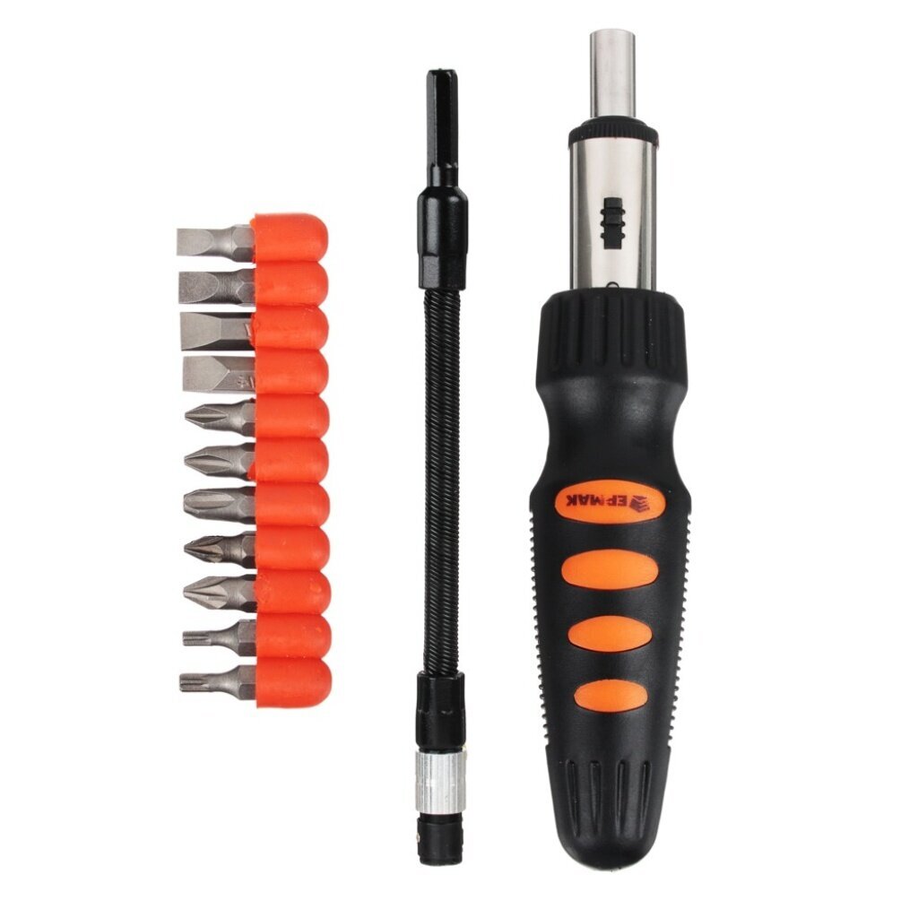Отвертка 13 предметов Ермак – универсальный инструмент для дома и дачи, который обеспечит удобство и надежность при любых ремонтных работах. Комплект включает гибкий стержень и адаптер 1/4", что позволяет работать в труднодоступных местах. Магнитные биты из прочной углеродистой стали гарантируют точность и долговечность. Эргономичная двухкомпонентная ручка из пластика и резины обеспечивает комфорт и надежный хват.