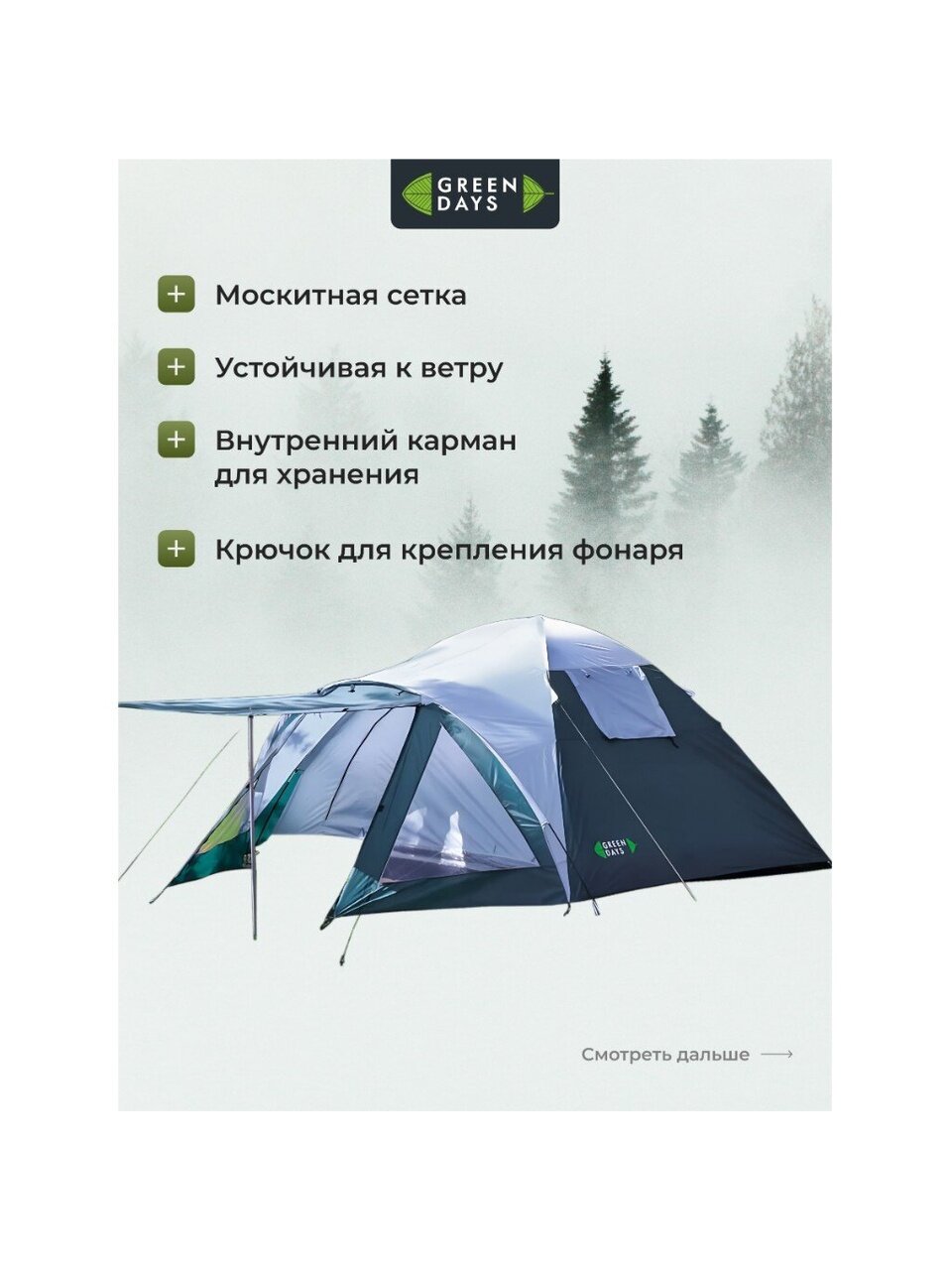 Независимо от того куда Вы отправляетесь, в поход, на рыбалку или кемпинг - у нас есть выбор вариантов палаток, в которых Вам будет комфортно наслаждаться прекрасным отдыхом на свежем воздухе. Сделайте свое приключение незабываемым, выбрав палатку Green Days.