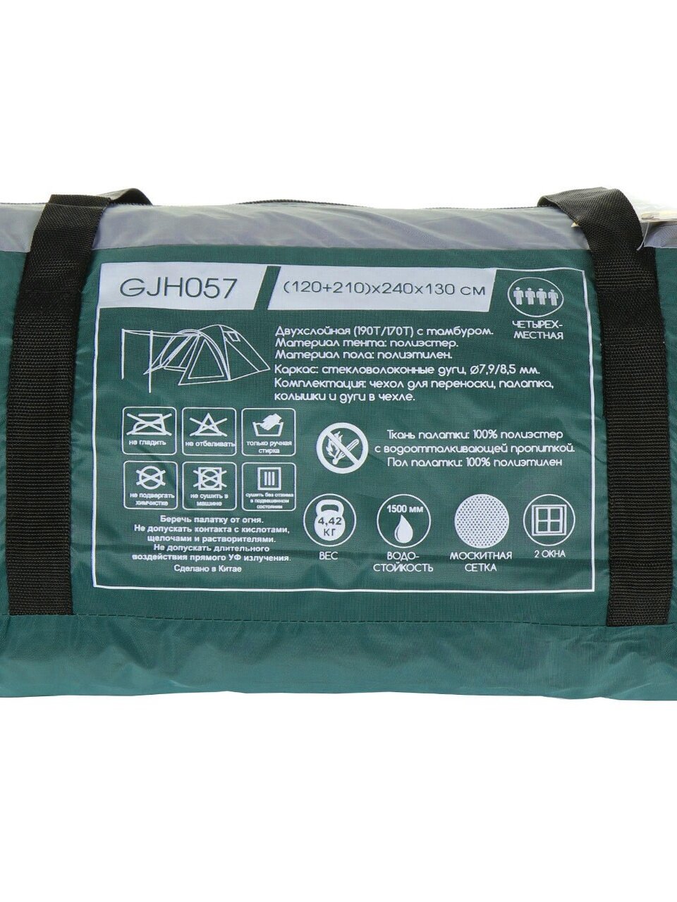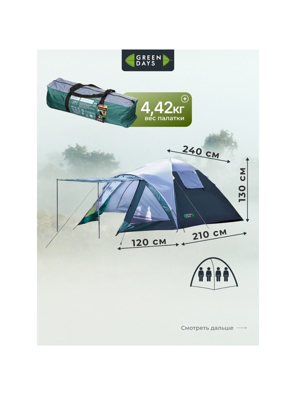 Вы можете приобрести «Палатка 4-местная, 210+120х240х130 см, 2 слоя, 1 комн, 1 тамб, с москитной сеткой, 2 вентиляционных окна, Green Days, GJH057» и другие товары в нашем интернет-магазине в Краснодаре по низким ценам и с бесплатным самовывозом.