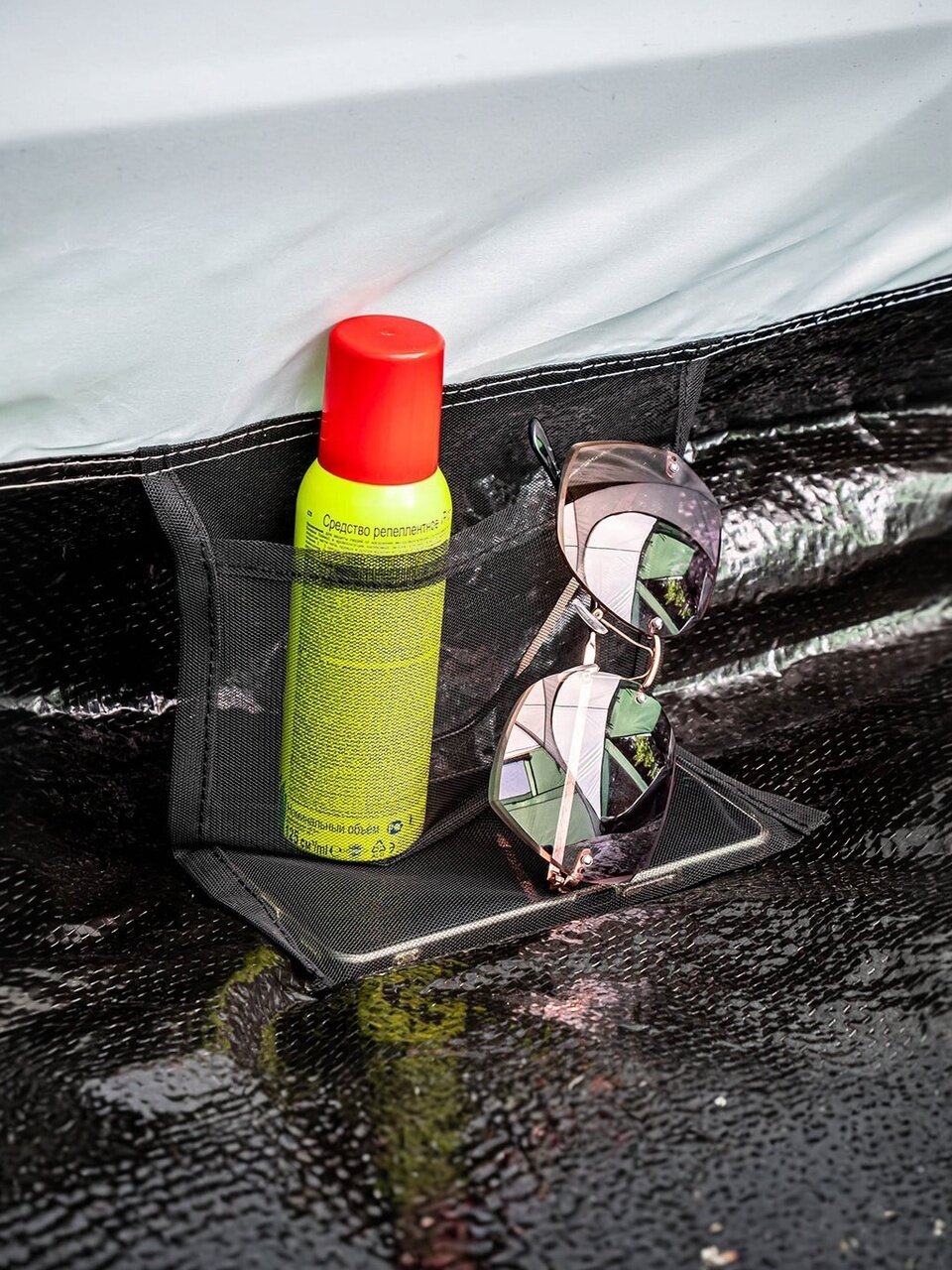 Полиэстер имеет водоотталкивающую пропитку. Она помогает отводить капли конденсата, появляющиеся между слоями, и позволяет ткани дышать. Водостойкость тента палатки 1500 мм водяного столба, что позволяет использовать палатку в небольшой дождь. Пол палатки несет большие нагрузки, так как он находится под давлением веса туристов и их вещей. Водостойкость дна составляет 3000 мм, что является оптимальным показателем для кемпинговых палаток. Показатель водостойкости указывает на то, что палатка выдержит и не промокнет при давлении тела туриста лежа. Полиэтилен предотвращает впитывание воды, росы и тумана.