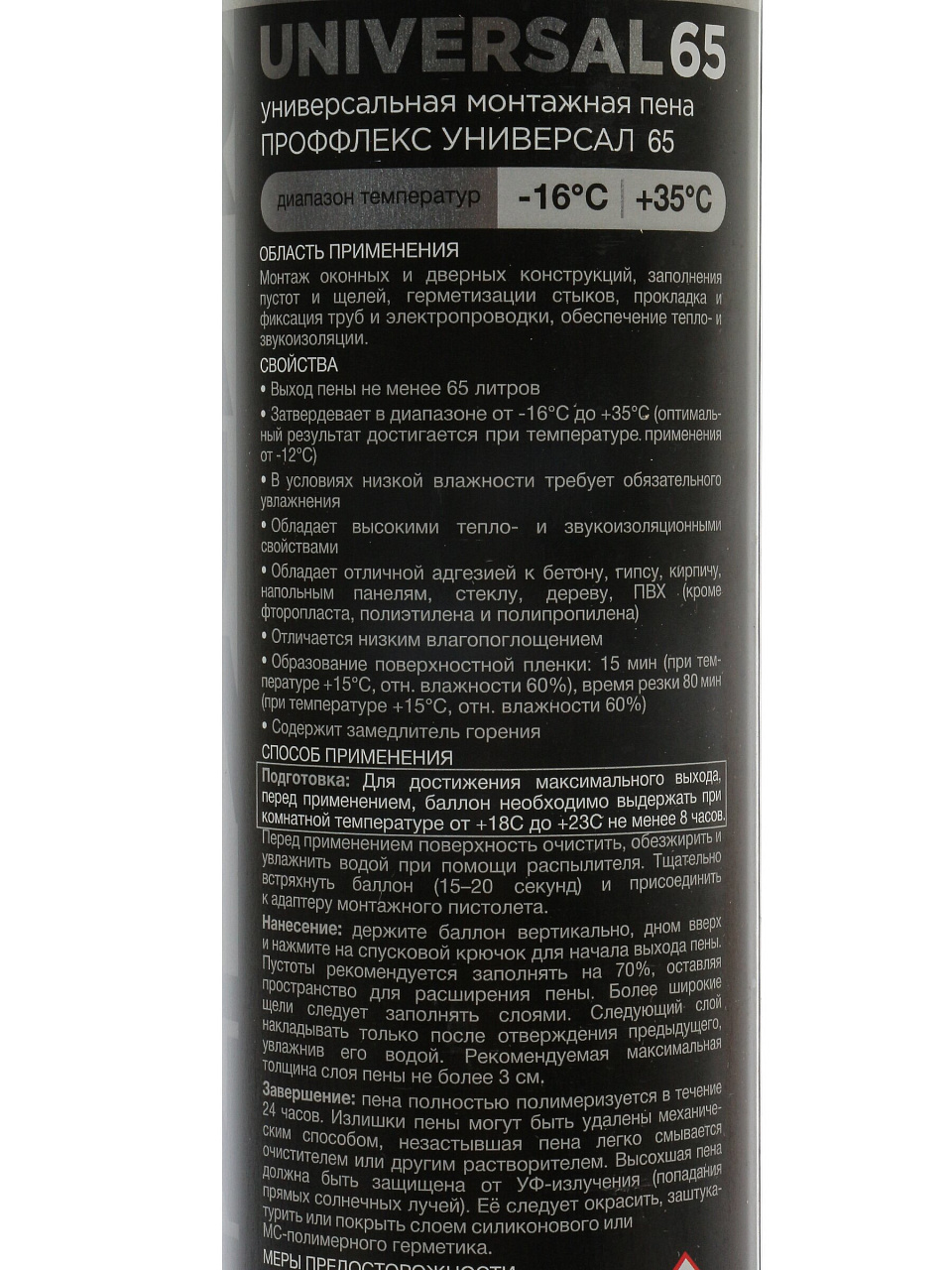 Профессиональная пена Profflex выпускается для пистолета, быстро высыхает (1 час), имеет высокую адгезию и огнестойкость, а также увеличенный объём выхода по сравнению с бытовыми аналогами.