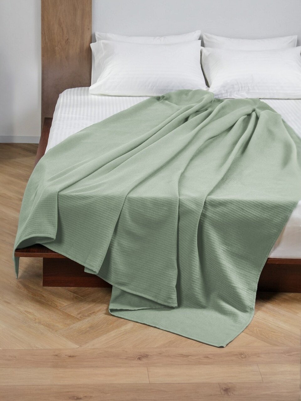 Плотность вафельной ткани 210 г/м2 гарантирует долговечность, устойчивость к износу и сохранение формы даже после многочисленных стирок. Натуральный хлопок не вызывает раздражения, подходит для ежедневного использования взрослыми. Простынь-плед легко стирается и быстро сохнет, что делает уход за изделием максимально простым и удобным.