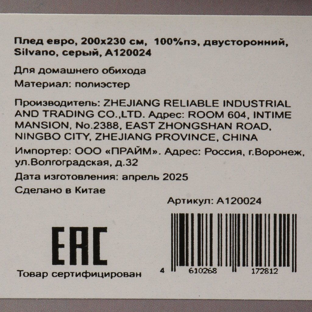 Плед евро, 200х230 см, 100%пэ, двусторонний, Silvano, серый, A120024