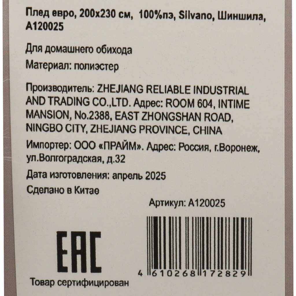 Плед евро, 200х230 см, 100%пэ, Silvano, Шиншила, A120025