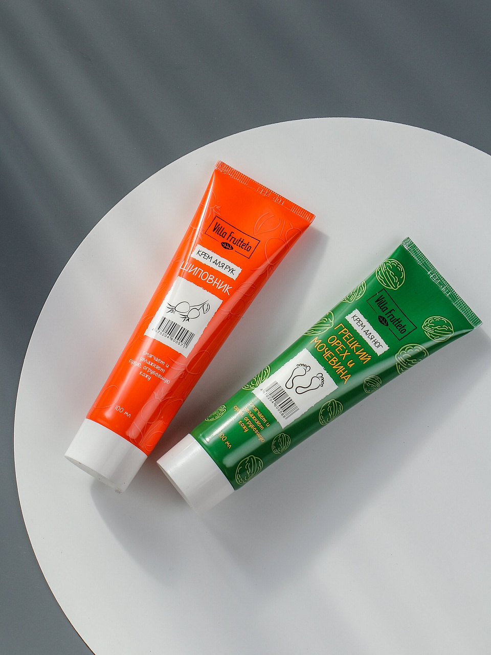 В наборе два тюбика: крем для рук 100 мл и крем для ног 100 мл. Это оптимальный объём для регулярного применения дома, на даче или в поездках.