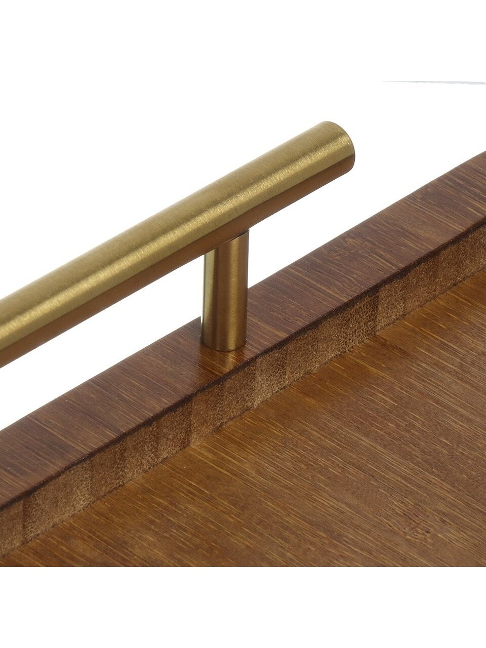 Изготовленный из натурального бамбука, поднос не только экологичен, но и обладает высокой прочностью и долговечностью. Его приятный коричневый цвет гармонично впишется в любой интерьер, добавляя нотку тепла и естественности. Металлические ручки обеспечивают надежный захват и легкость в переноске, а бортики предотвращают случайное скольжение предметов.