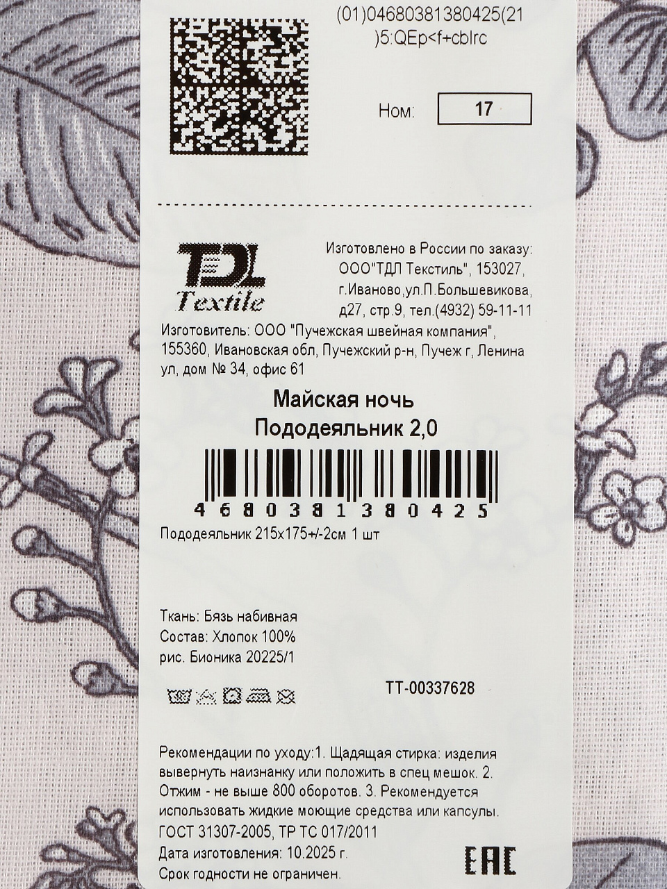 Размер 175х215 см — стандарт для двуспальных одеял, подходит для большинства моделей российских производителей. Материал — 100% хлопок, бязь.