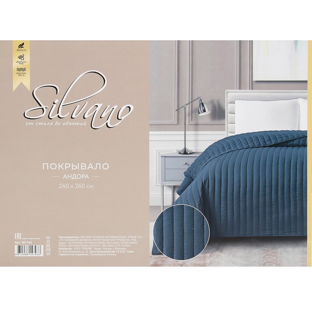 Покрывало Silvano Андора 240×260 см — стильное решение для спальни и гостиной: премиум-полиэстер, глубокий синий, подходит для кровати и дивана, легко ухаживать.