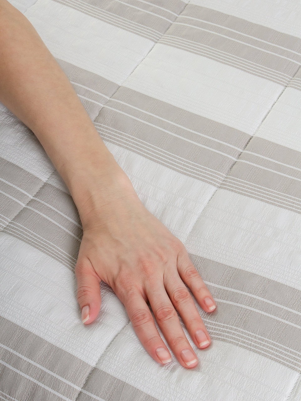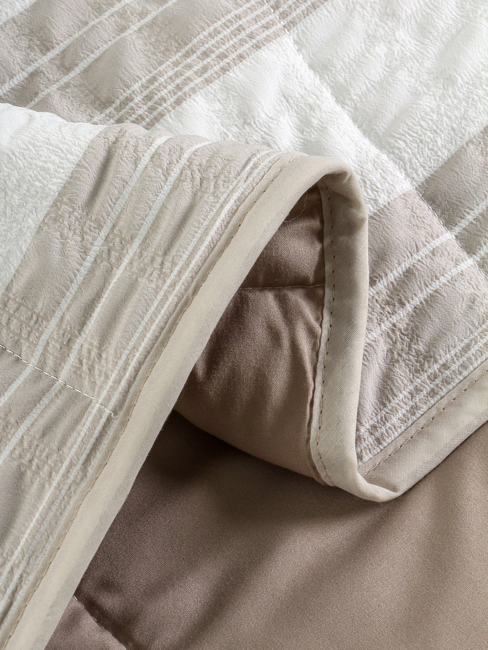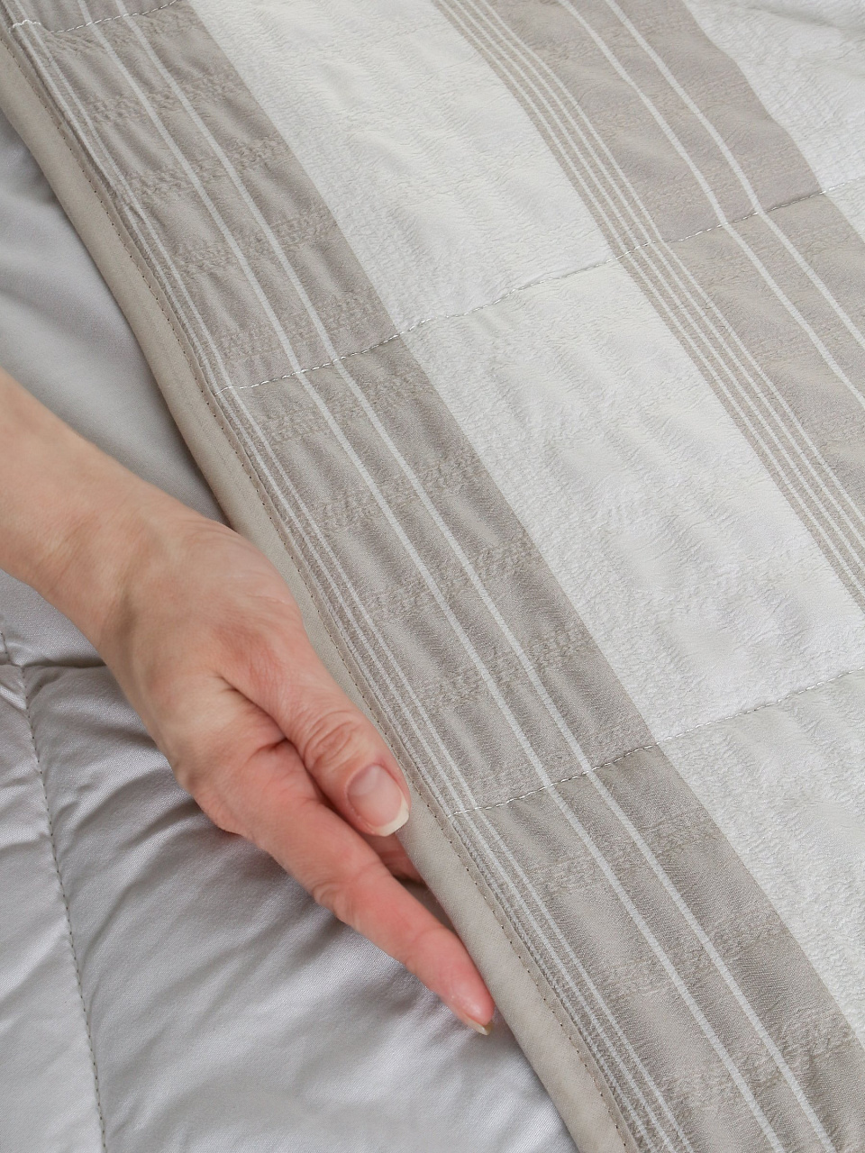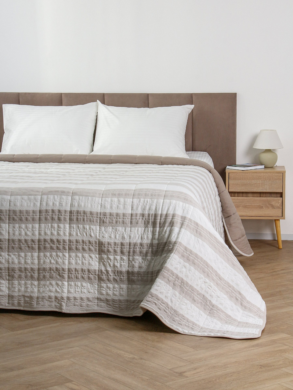 Фактурная отделка с геометрическим рисунком и декоративным кантом придает изделию объем. В отличие от гладких моделей, такое покрывало выглядит более дорого и эффектно, скрывая возможные неровности постельного белья под ним.