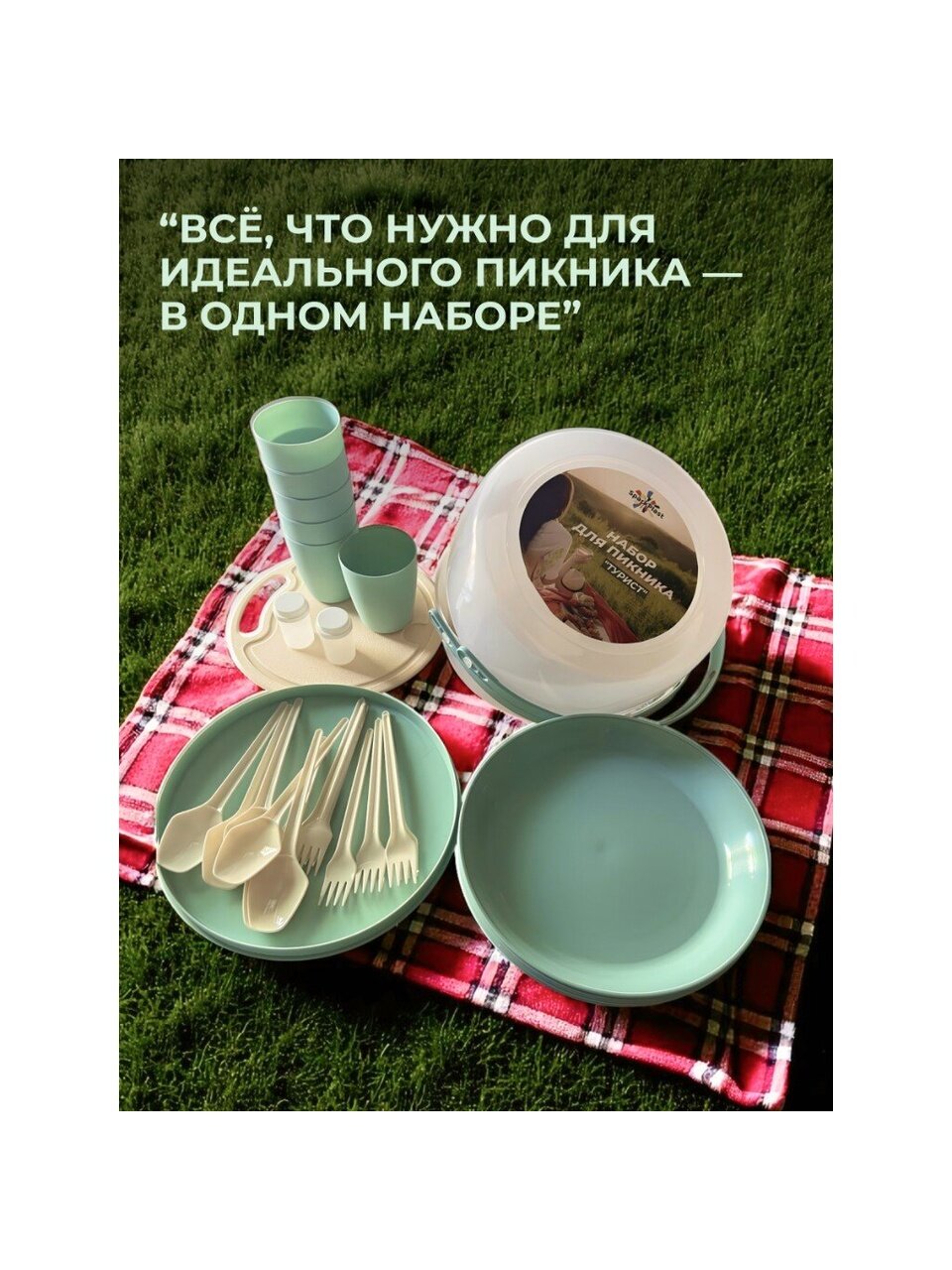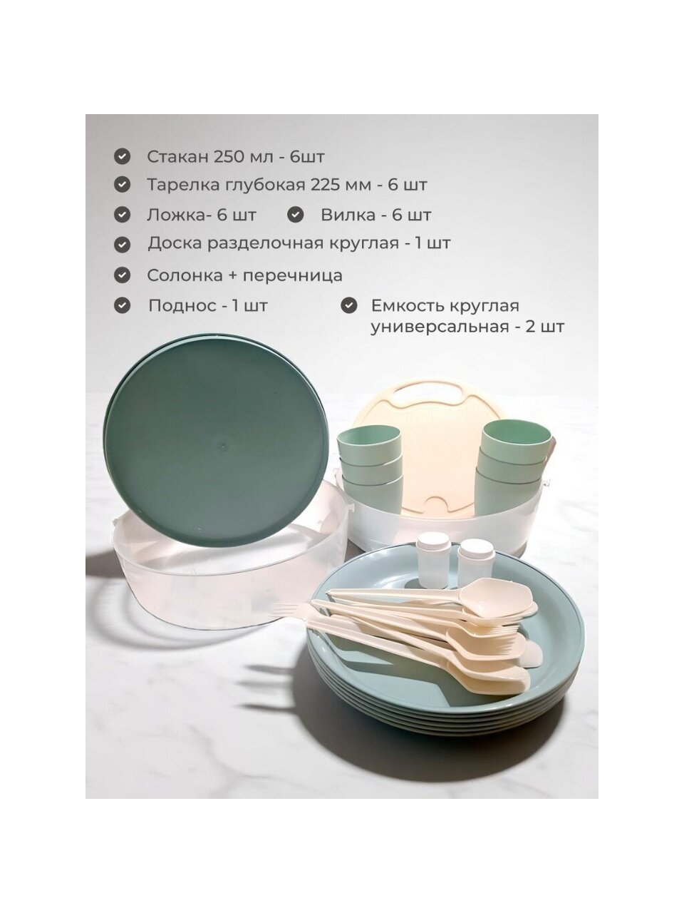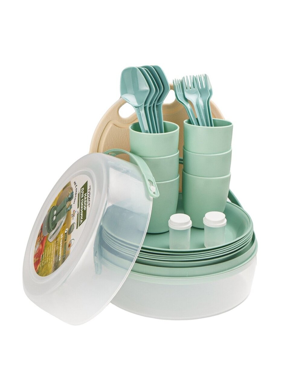 Настала теплая пора и вы уже мечтаете пойти на природу и приготовить вкуснейшие шашлыки, но встал вопрос, какую посуду взять с собой? Тогда вам просто необходим набор пластиковой посуды Турист в удобном кейсе с ручкой для переноски из 30 предметов, который станет неотъемлимым спутником для похода на пикник, шашлыки, поездку на дачу, либо просто на природу. В комплекте есть все необходимое для того, чтобы накрыть стол на 6 человек: тарелки, вилки, ложки, стаканчики, солонка, разделочная доска - вам останется положить свой любимый кухонный нож, и вы полностью готовы к приему пищи на свежем воздухе!