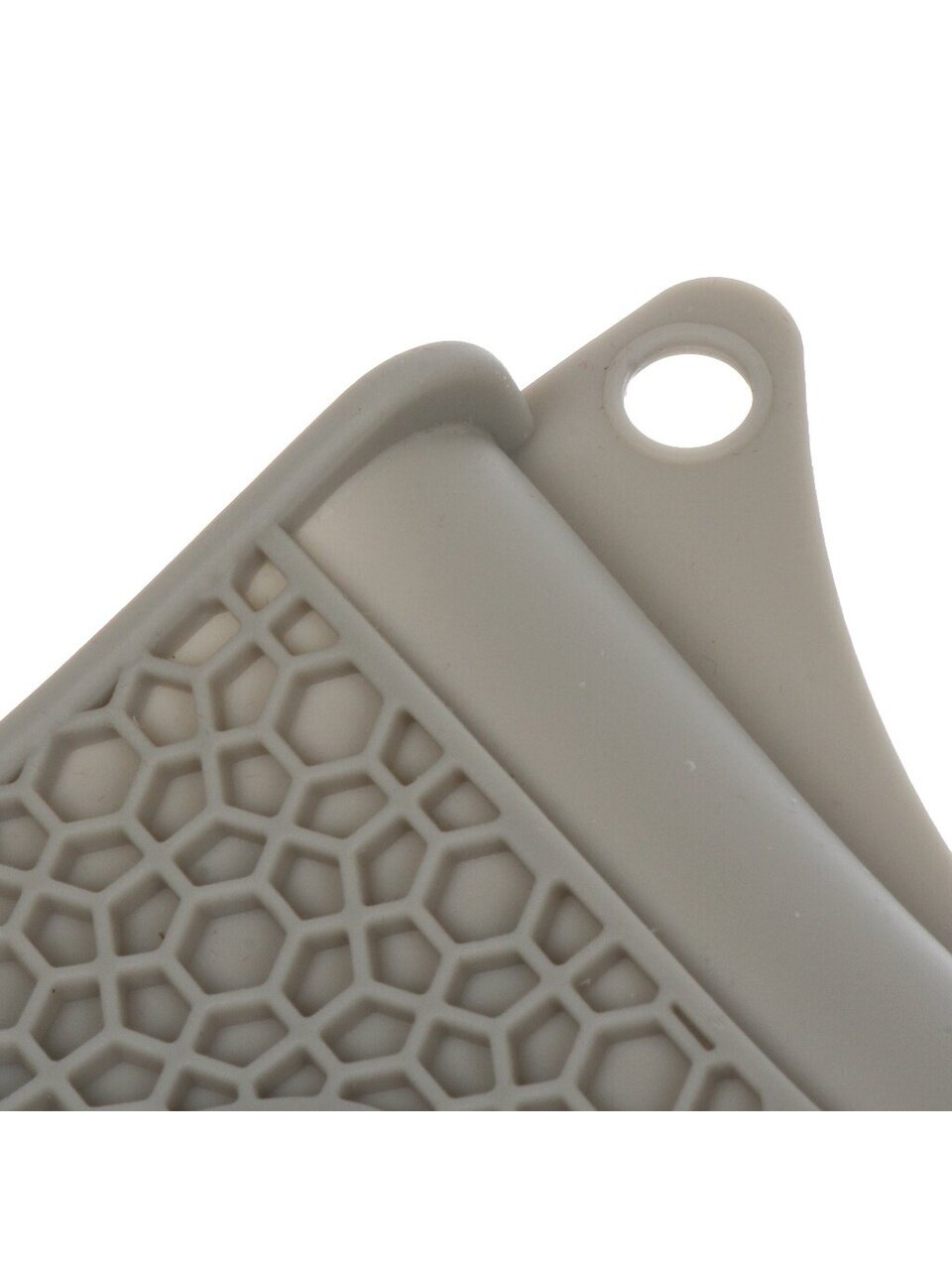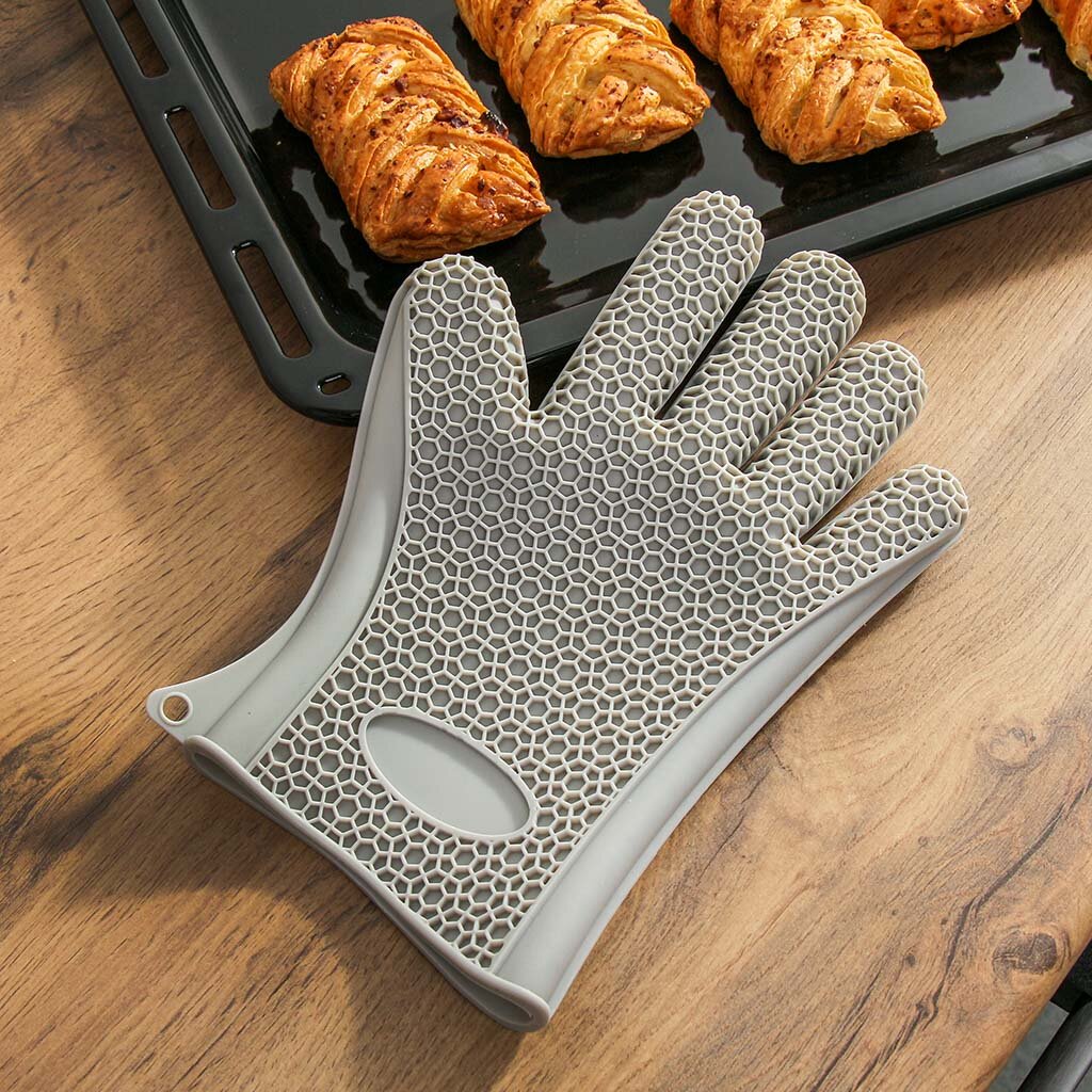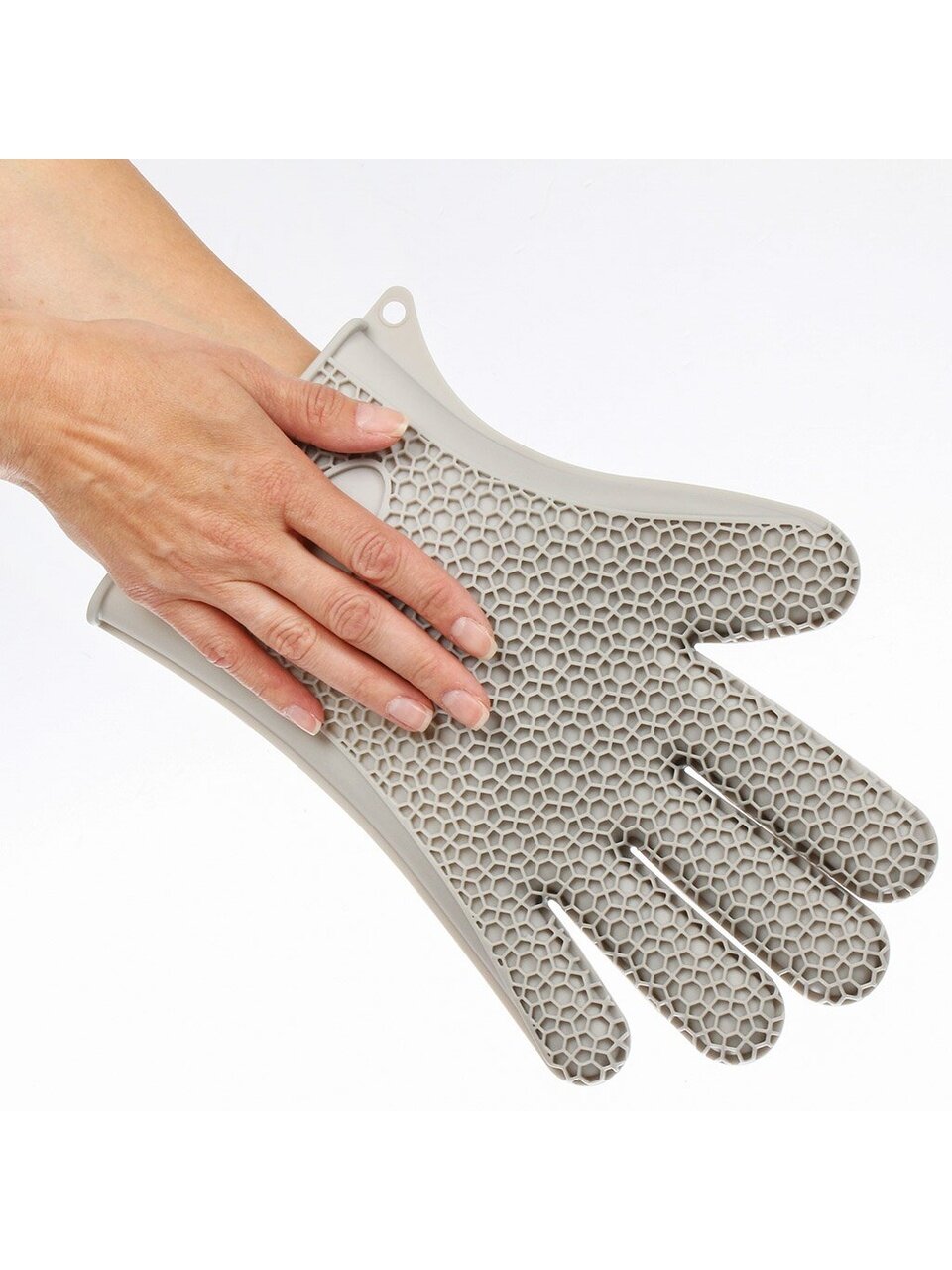 Размер прихватки-рукавицы: 27х20х2,5 см, цвет — серый; форма — перчатка, материал — 100% силикон.