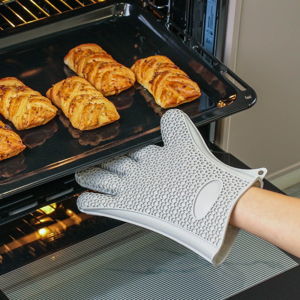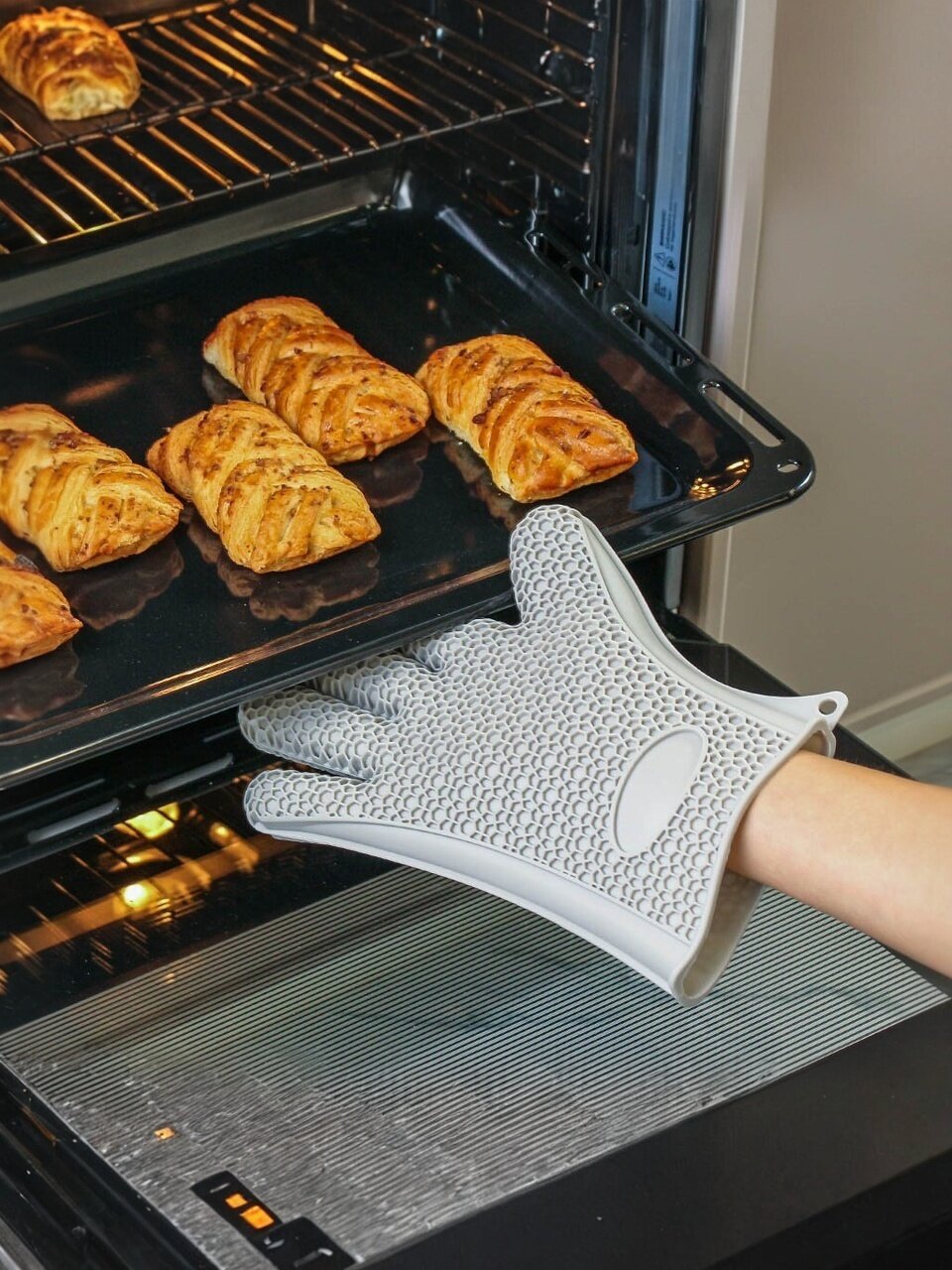 - Максимальная термозащита: силиконовая перчатка защищает руки от ожогов при работе с горячими противнями и кастрюлями.