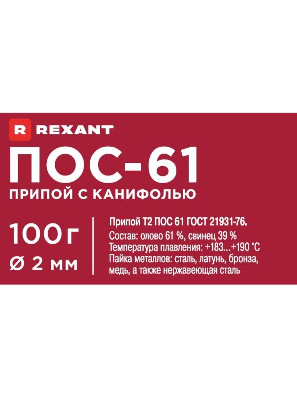 Вы можете приобрести «Припой с канифолью ПОС-61 Sn61% Pb39%, Rexant, 100 г, диаметр 2 мм, катушка, 09-3173» и другие товары в нашем интернет-магазине в Краснодаре по низким ценам и с бесплатным самовывозом.