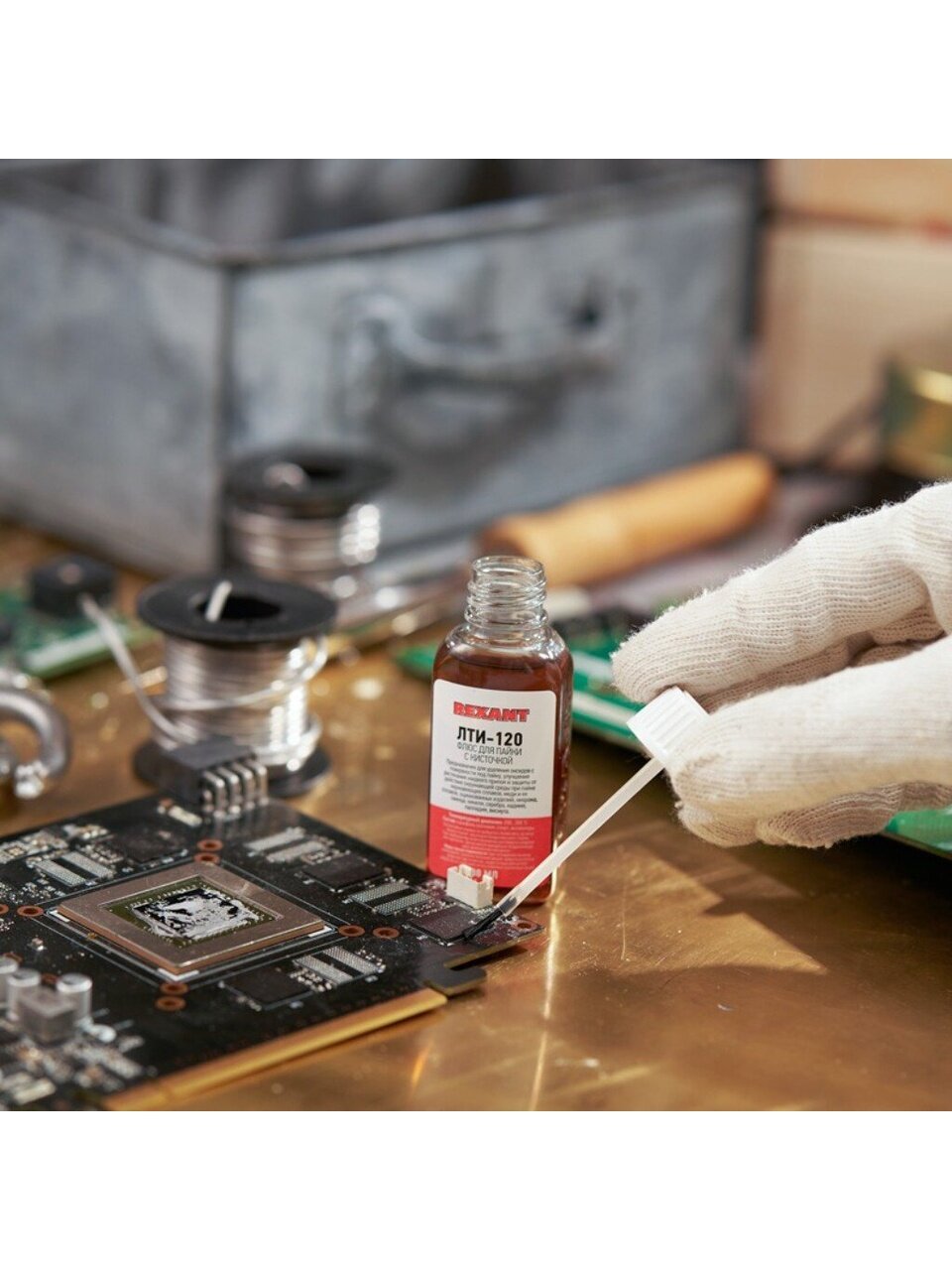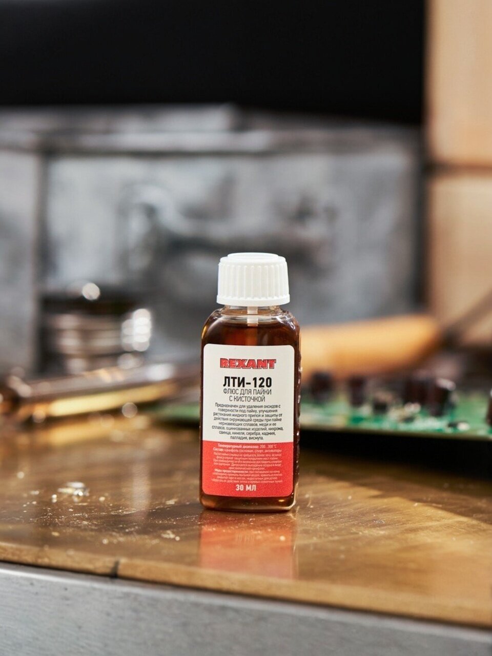Флюс для пайки REXANT ЛТИ-120 с кисточкой — идеальное решение для качественной и быстрой пайки радиоэлектроники и печатных плат. Низкотемпературный состав обеспечивает прочные соединения, не требует смывки после пайки, а остатки создают защитный слой. Удобная кисточка облегчает нанесение, а безопасная формула не проводит ток. Объем 30 мл подходит для домашних и дачных работ.