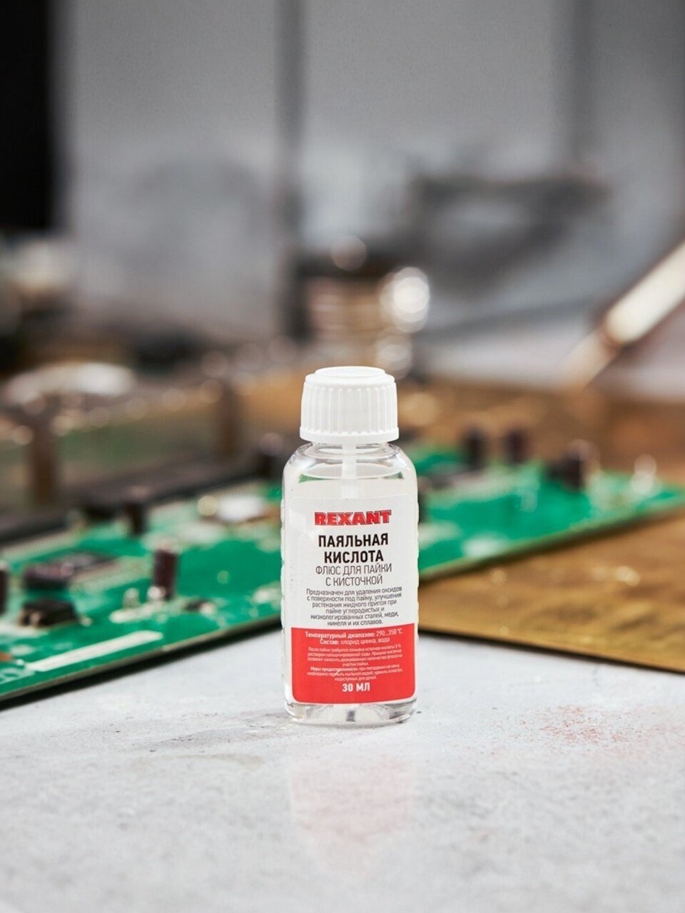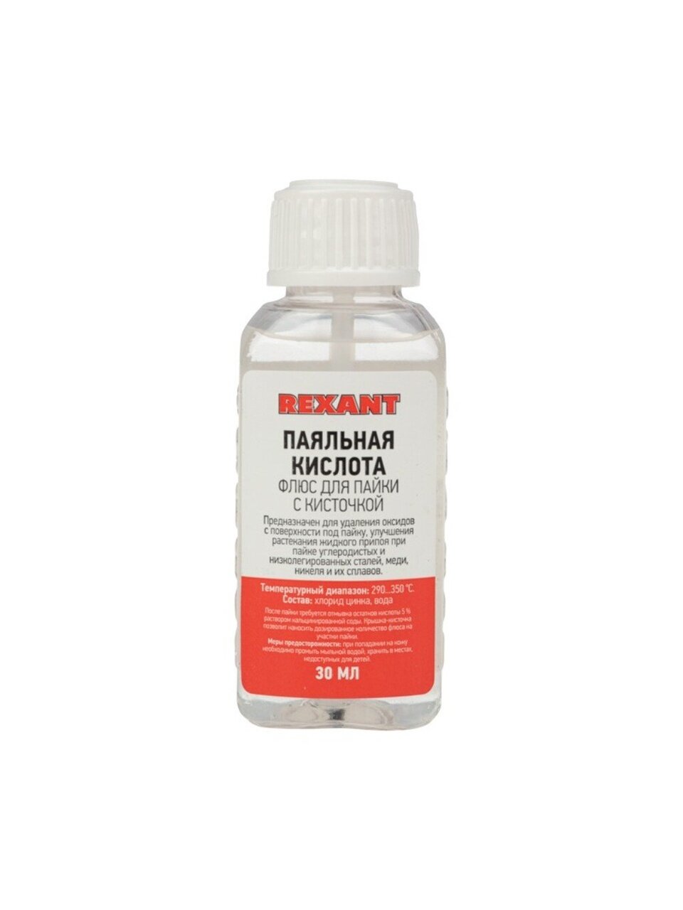 Флюс для пайки REXANT, Паяльная кислота, 30 мл — профессиональный выбор для эффективной пайки и лужения деталей с применением оловянно-свинцовых припоев. Высокая проникаемость состава позволяет легко обрабатывать даже самые труднодоступные контакты, что делает работу быстрой и аккуратной. Благодаря удобной кисточке нанесение становится максимально точным. После пайки рекомендуется смыть остатки кислоты 5% раствором кальцинированной соды.