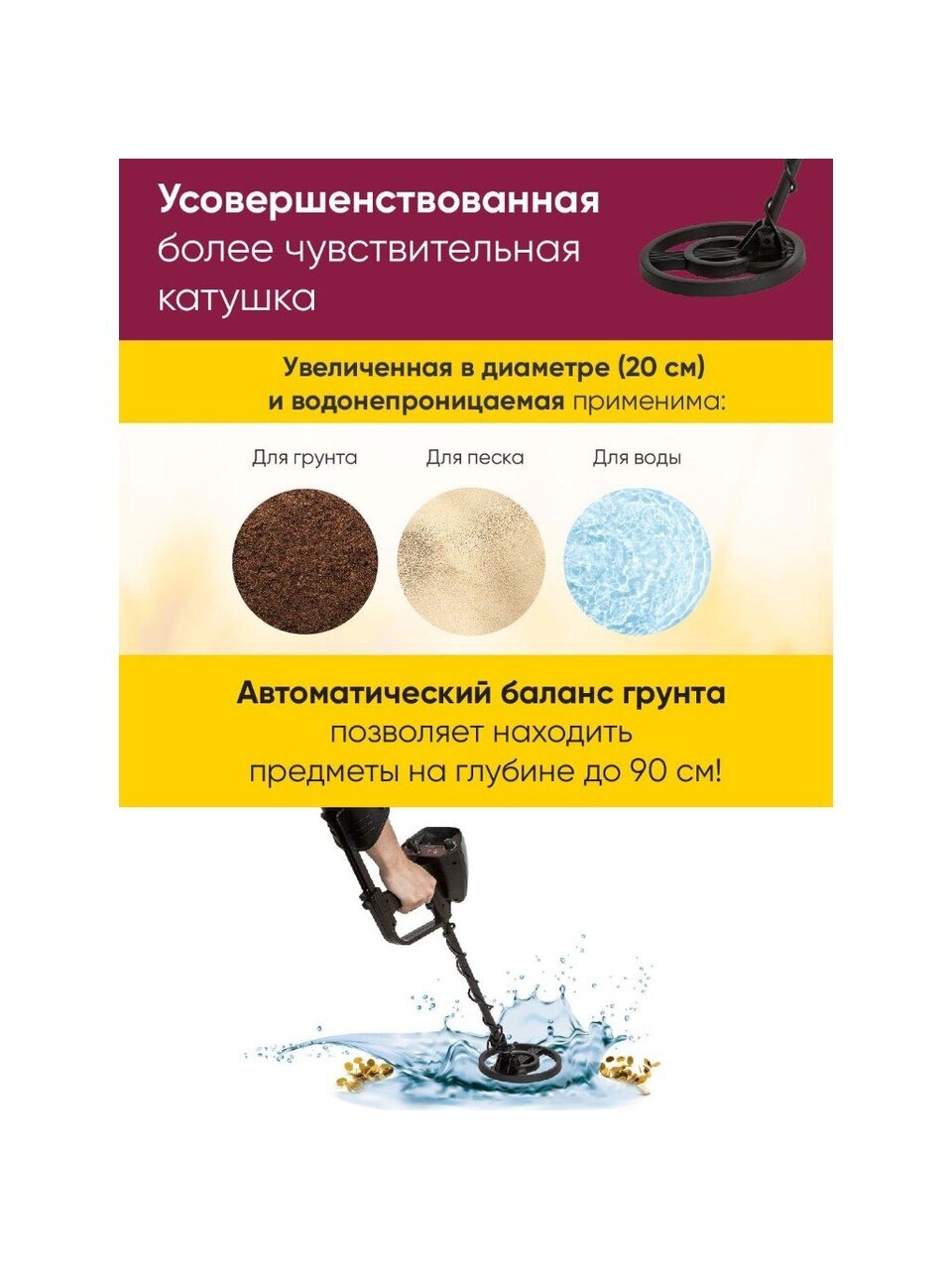 - Металлоискатель с водонепроницаемой катушкой открывает новые горизонты для поиска металлов. Теперь вы можете исследовать пляжи, озера и реки на глубине до 40 см, не беспокоясь о повреждении инструмента водой.