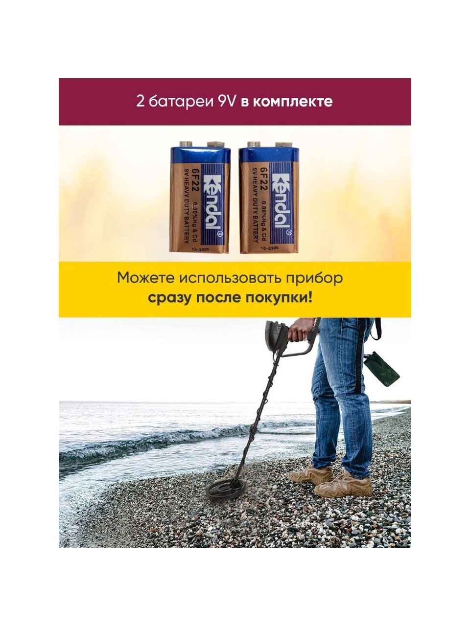 - Металлоискатель работает на обычных батарейках типа 9V, и если они разрядятся, вы всегда сможете заменить их.