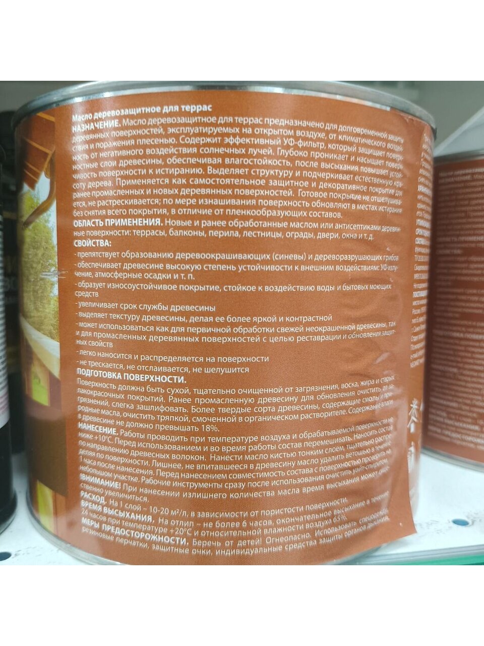 «NEOMID Масло деревозащитное для террас» предназначено для долговременной защиты деревянных поверхностей, эксплуатируемых на открытом воздухе, от климатического воздействия и поражения плесенью. Содержит эффективный УФ-фильтр, который защищает поверхность от негативного воздействия солнечных лучей. Глубоко проникает и насыщает поверхностные слои древесины, обеспечивая влагостойкость, после высыхания повышает устойчивость поверхности к истиранию. Выделяет структуру и подчеркивает естественную красоту дерева. Применяется как самостоятельное защитное и декоративное покрытие для ранее промасленных и новых деревянных поверхностей.