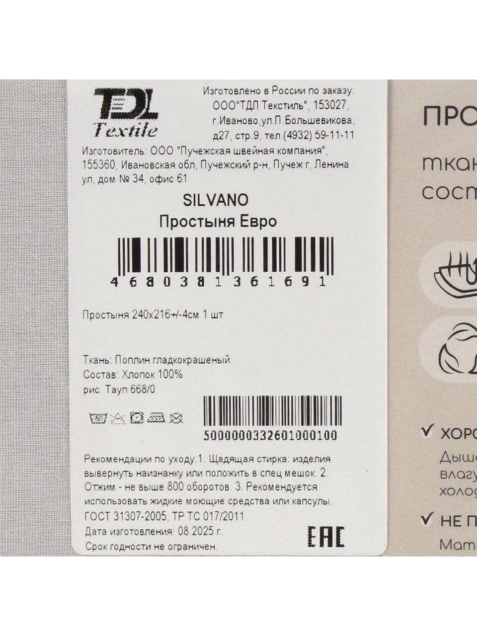 Простыня евро 216х240 см из 100% хлопка поплин Silvano: комфортный сон без складок, долговечность, идеальный выбор для современного интерьера.