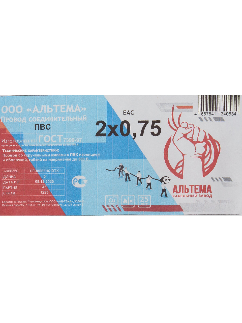 2 медные жилы по 0.75 мм², длина 5 м, гибкая белая изоляция, стандарт ПВС, сертифицирован по ГОСТ, артикул А000504.