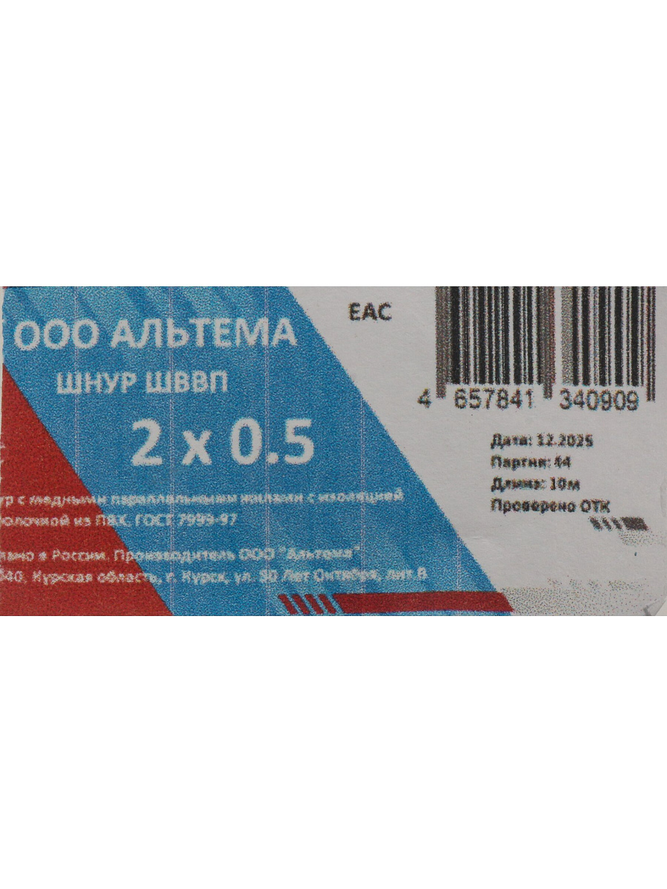 Два медных проводника по 0.5 мм², длина 10 м, белая изоляция, стандарт ГОСТ, бренд Альтема, артикул А000440.