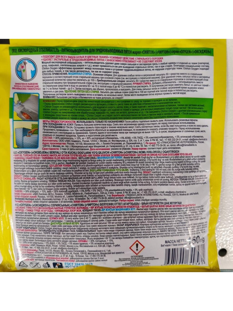 - Мощный кислородный отбеливатель-пятновыводитель Chirton Oxygen удаляет даже самую сильную и застарелую грязь с любой одежды и любых изделий из тканей;