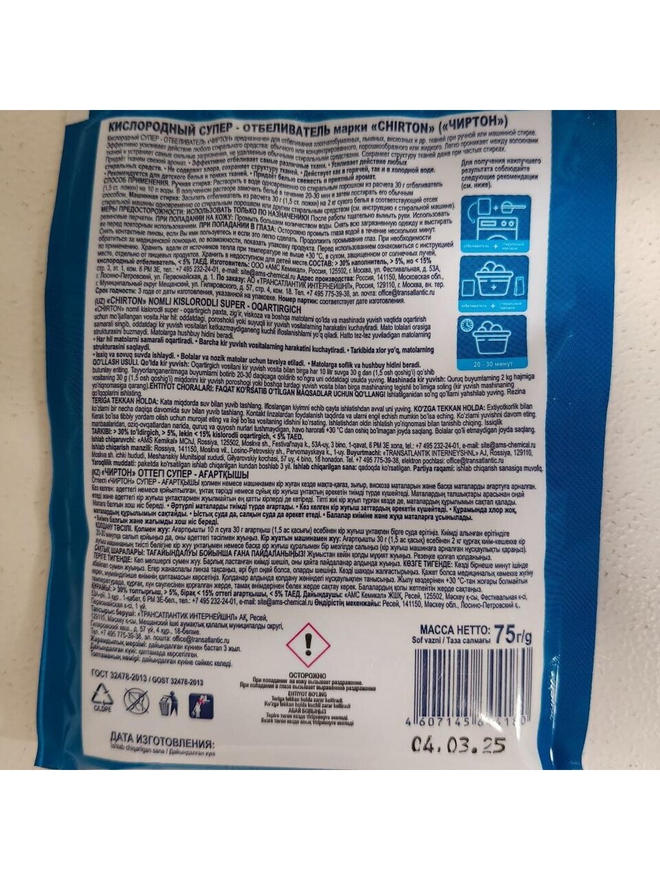 - Предназначен для отбеливания хлопчатобумажных, льняных, вискозных и др. тканей при ручной или машинной стирке;