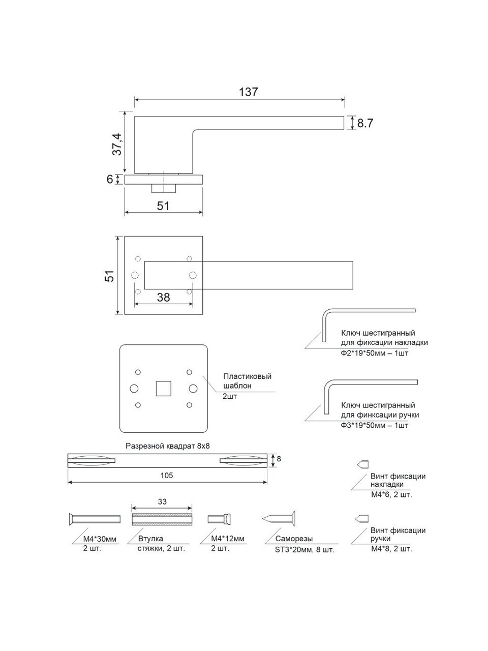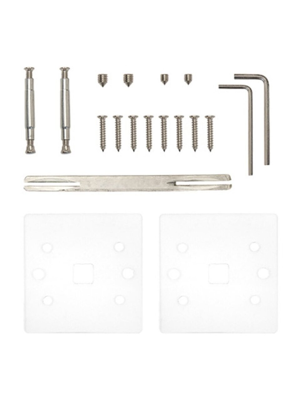 - Тип крепежа: стяжки M4 12(33)30 - 2 шт, саморезы SТ3*20 - 8 шт, винт фиксации - 4 шт, ключ шестигранный - 2 шт;
