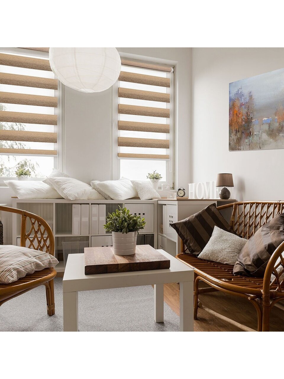 Рулонная штора "День-Ночь" - это отличное решение в оформлении окна. Рулонная штора состоит из ткани, с чередующимися полосами из прозрачного и непрозрачного материала, расположенной в два слоя. Уникальность двойной рулонной шторы заключается в её универсальности. Она имеет и привлекательный внешний вид, и легка в управлении, и, кроме того, даёт возможность контролировать интенсивность солнечного света, непосредственно на самом изделии.