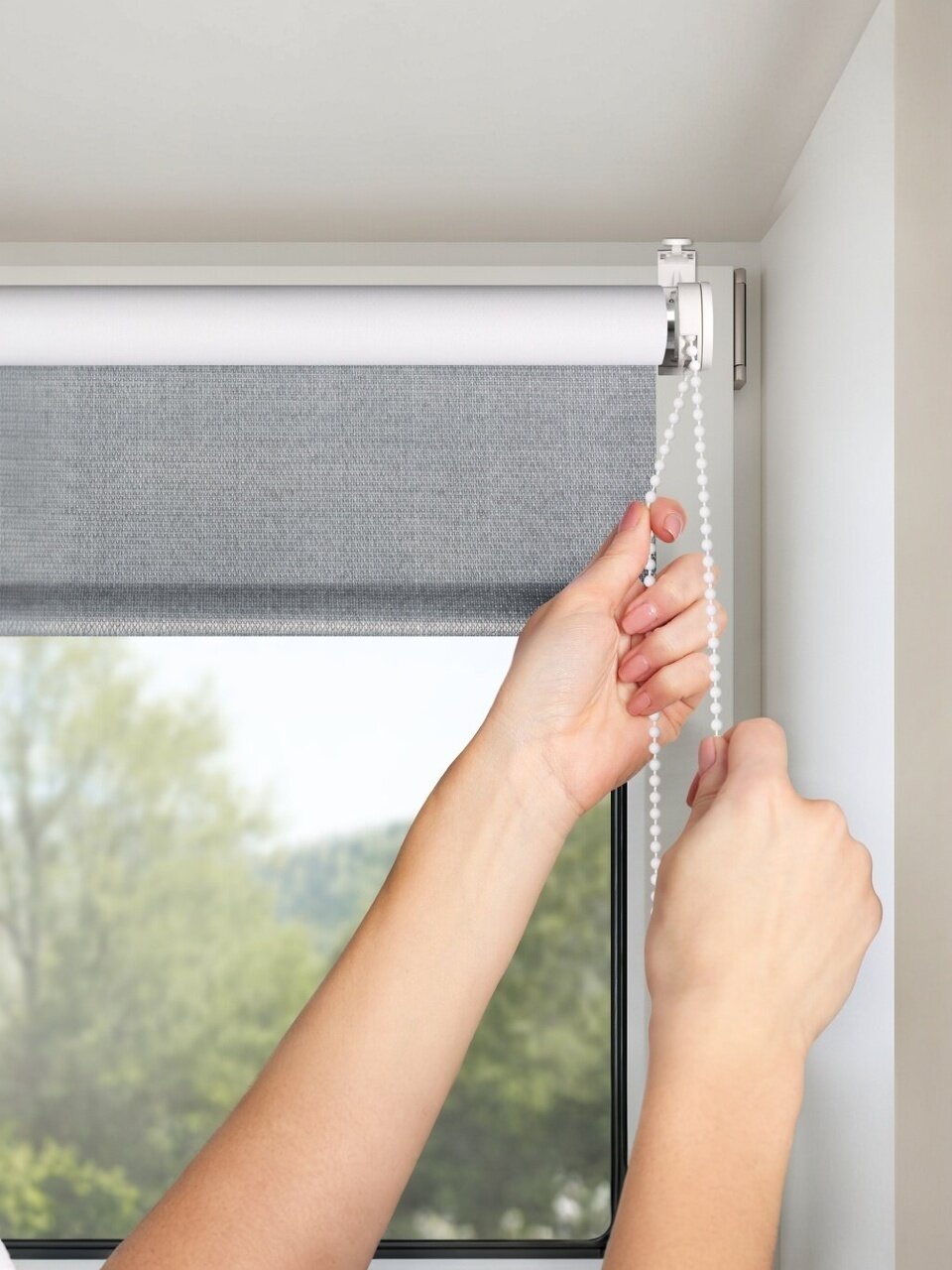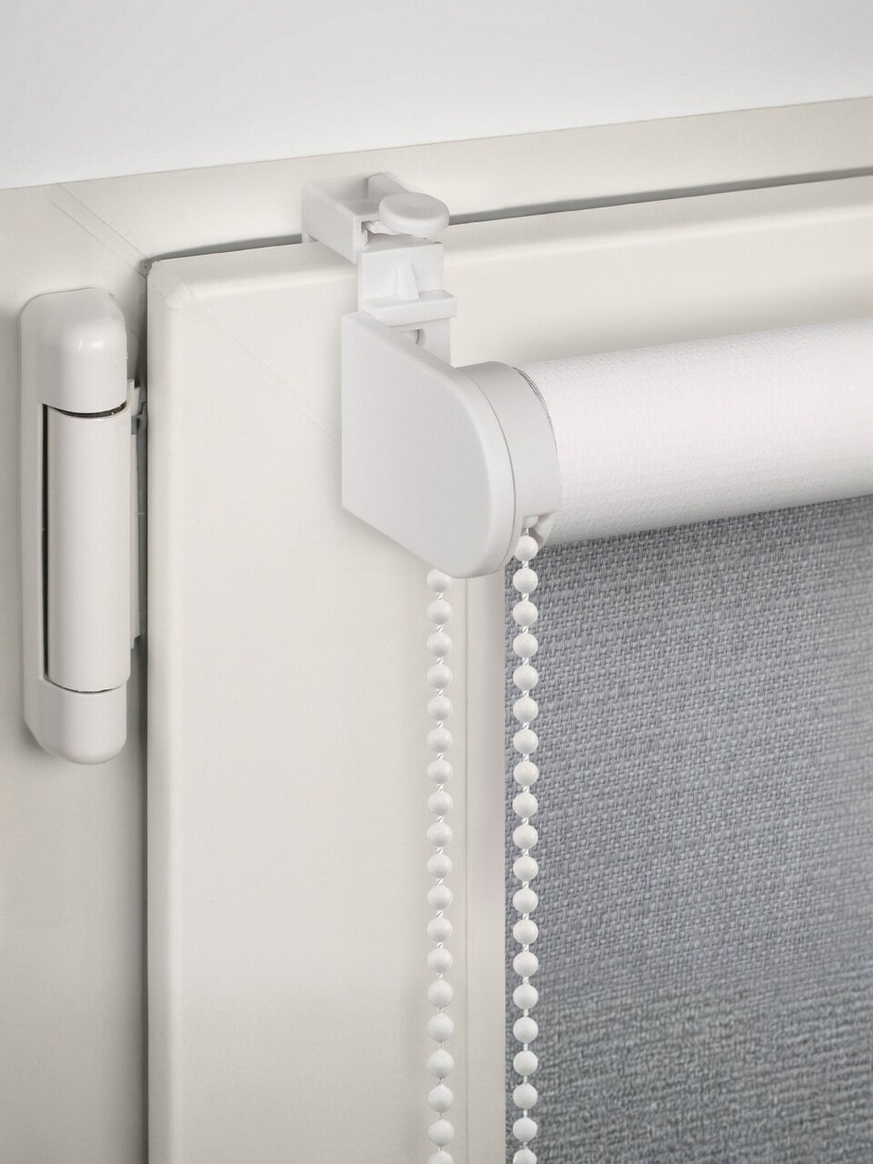 Конструкция состоит из рулона ткани, вала для намотки, двух кронштейнов крепления и механизма управления. Работа рулонных жалюзи происходит путем наматывания материала вверх или разматывания вниз с помощью цепочного механизма, который устанавливается на выбор слева или справа.