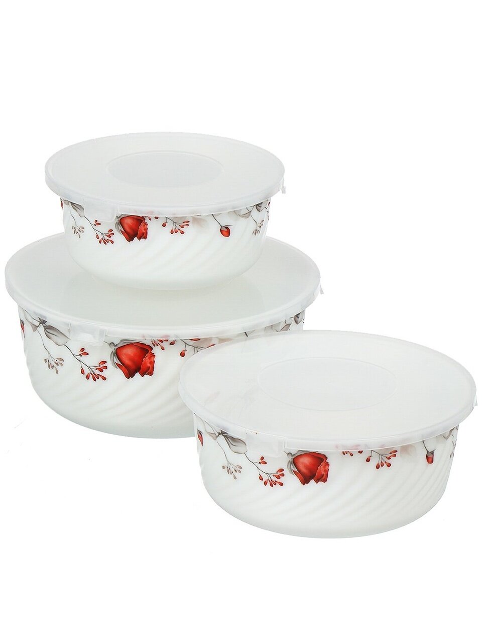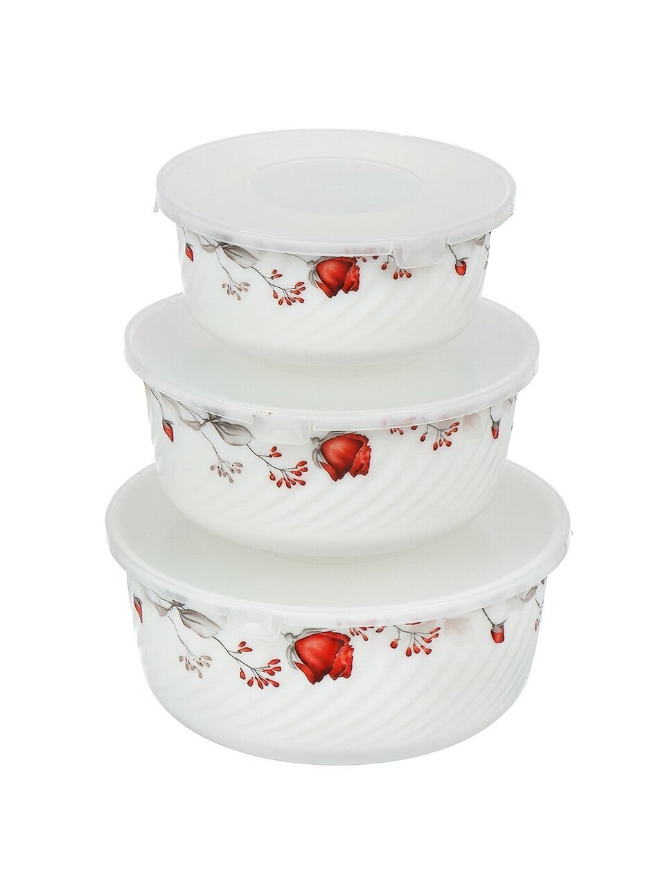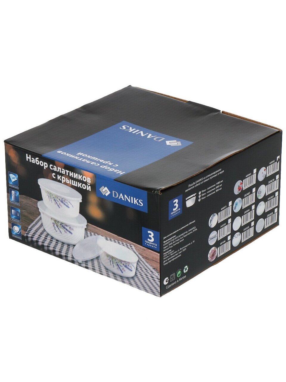 Салатники Daniks Вероника из стеклокерамики: набор из 3 круглых мисок с крышками (0.5/0.8/1.4 л), стиль прованс, прочность и универсальность для дома и дачи.