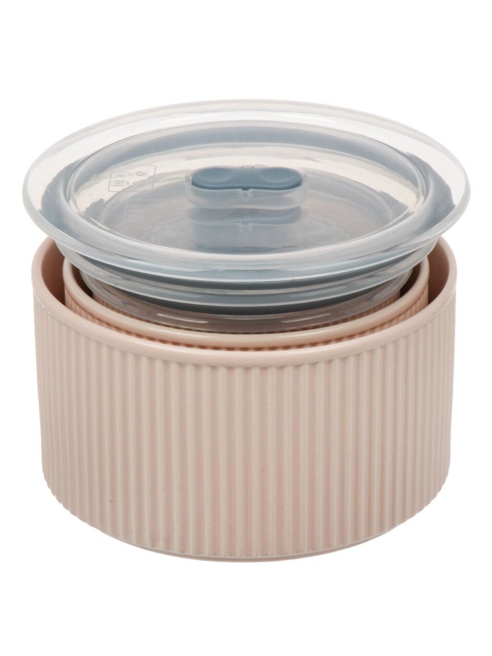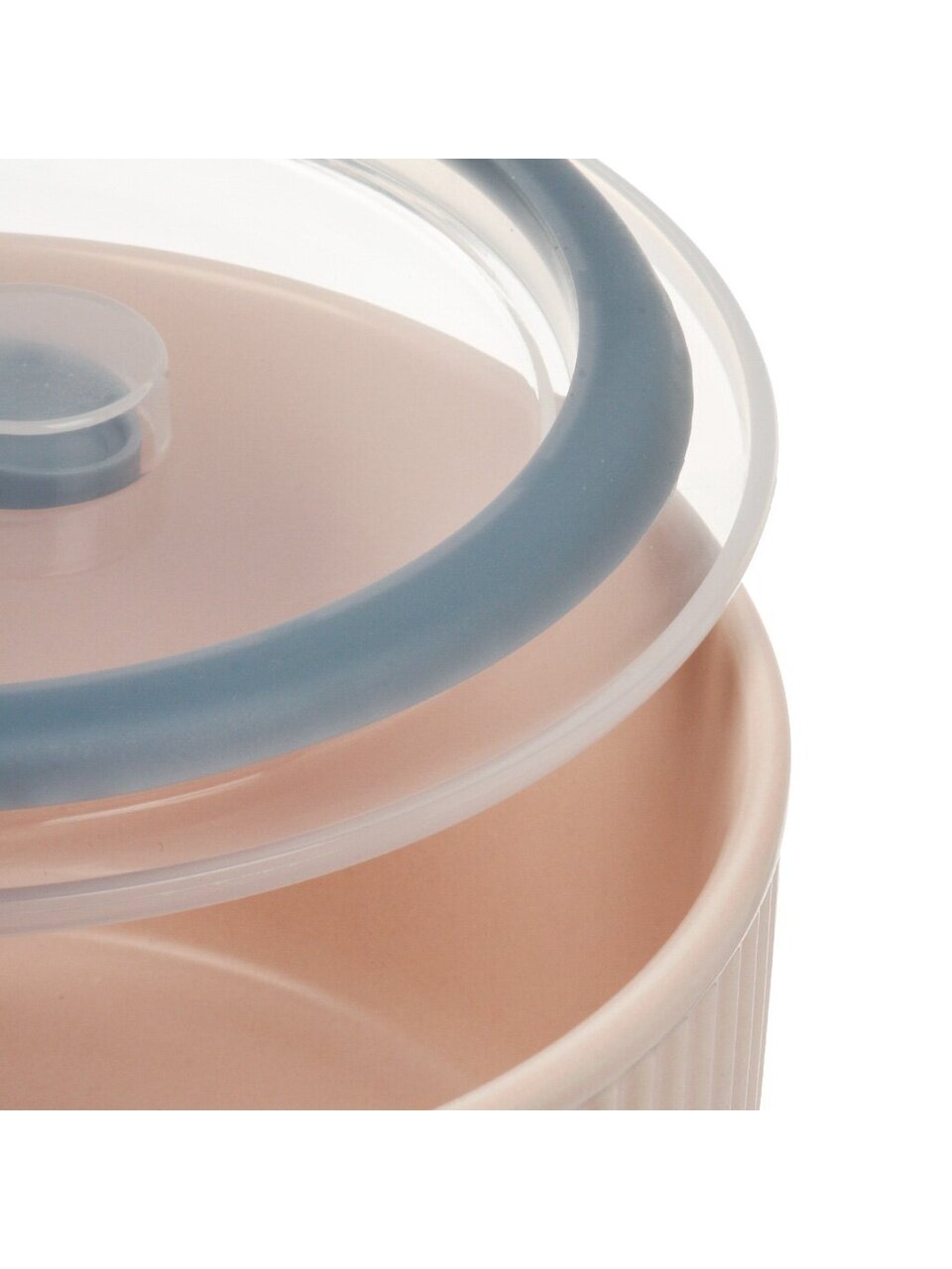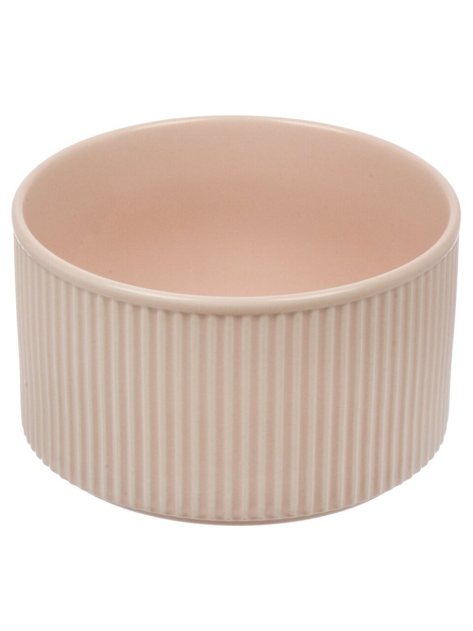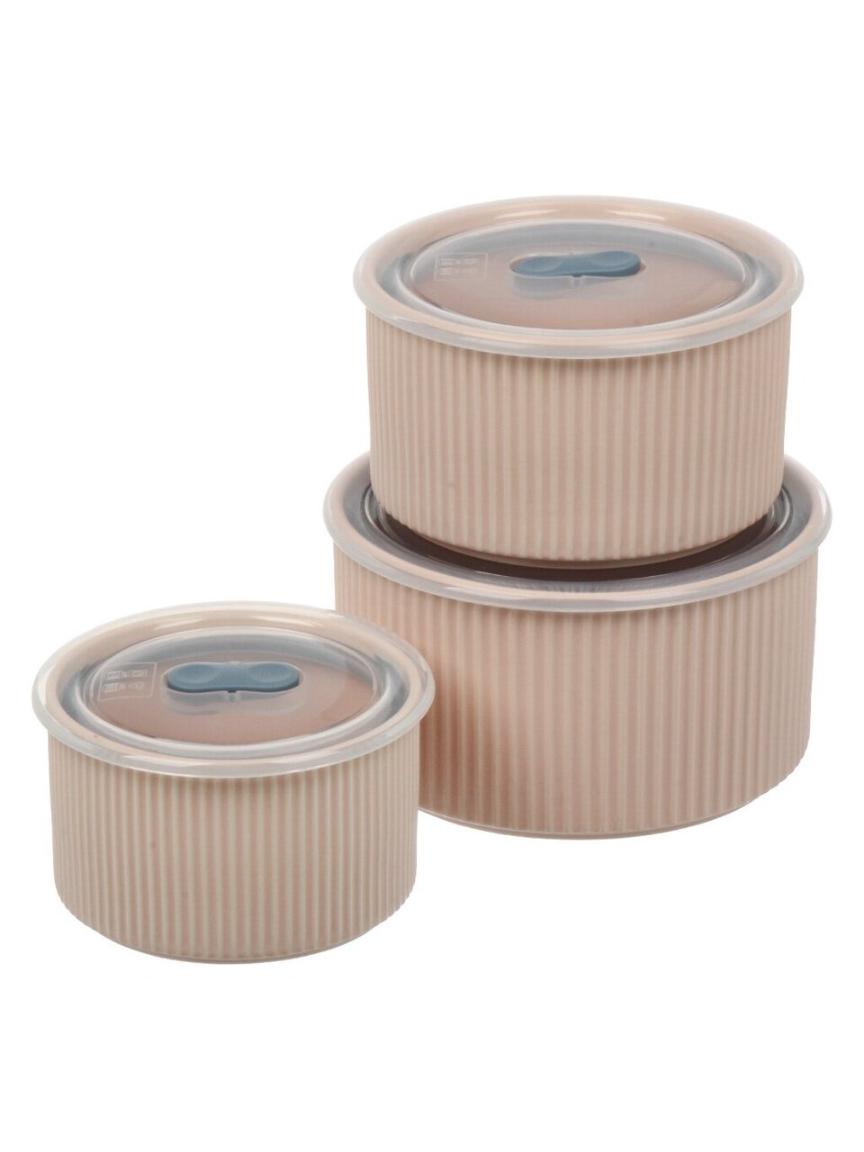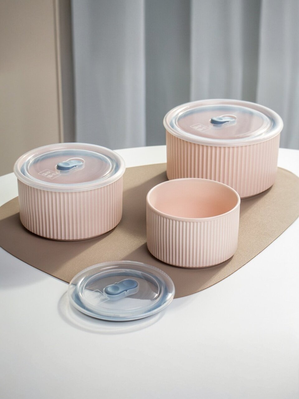 В наборе три салатника: 17х9 см, 15х7.5 см и 12.5х7 см. Все с крышками, выполнены из керамики, цвет — розовый, форма — круглая, дизайн — однотонный с рельефом.