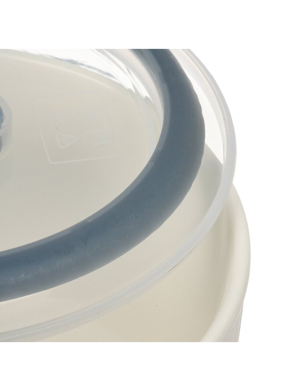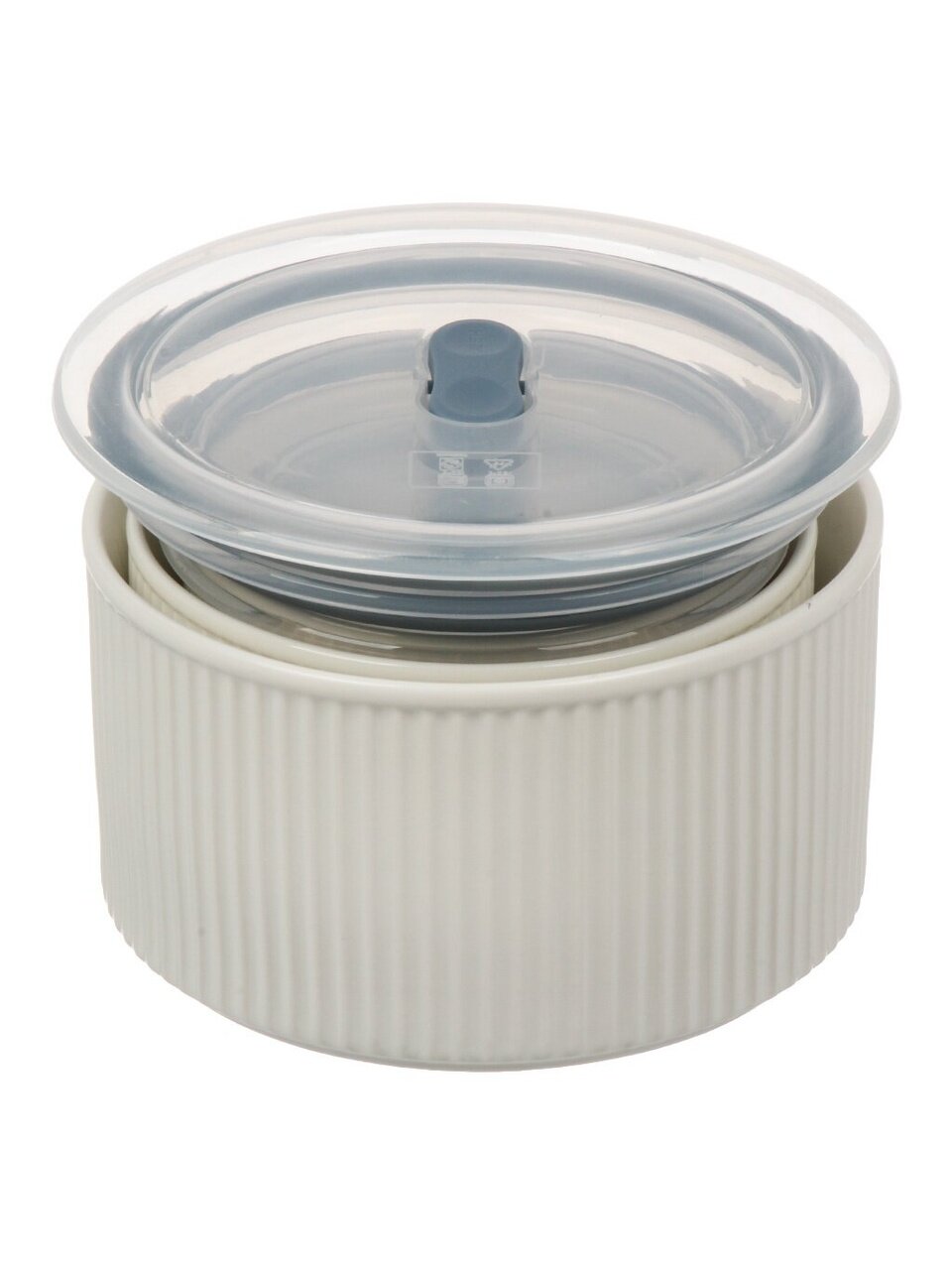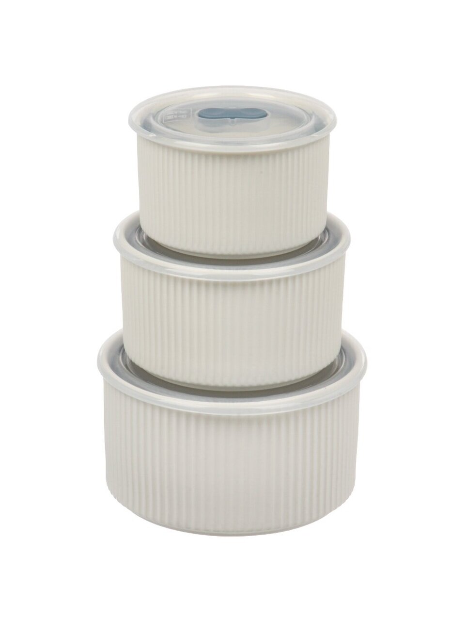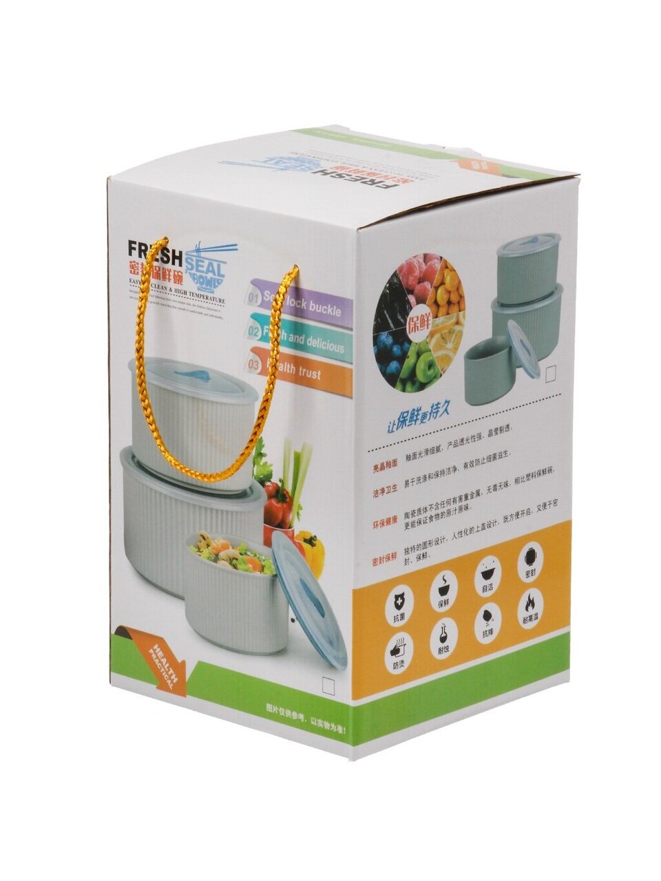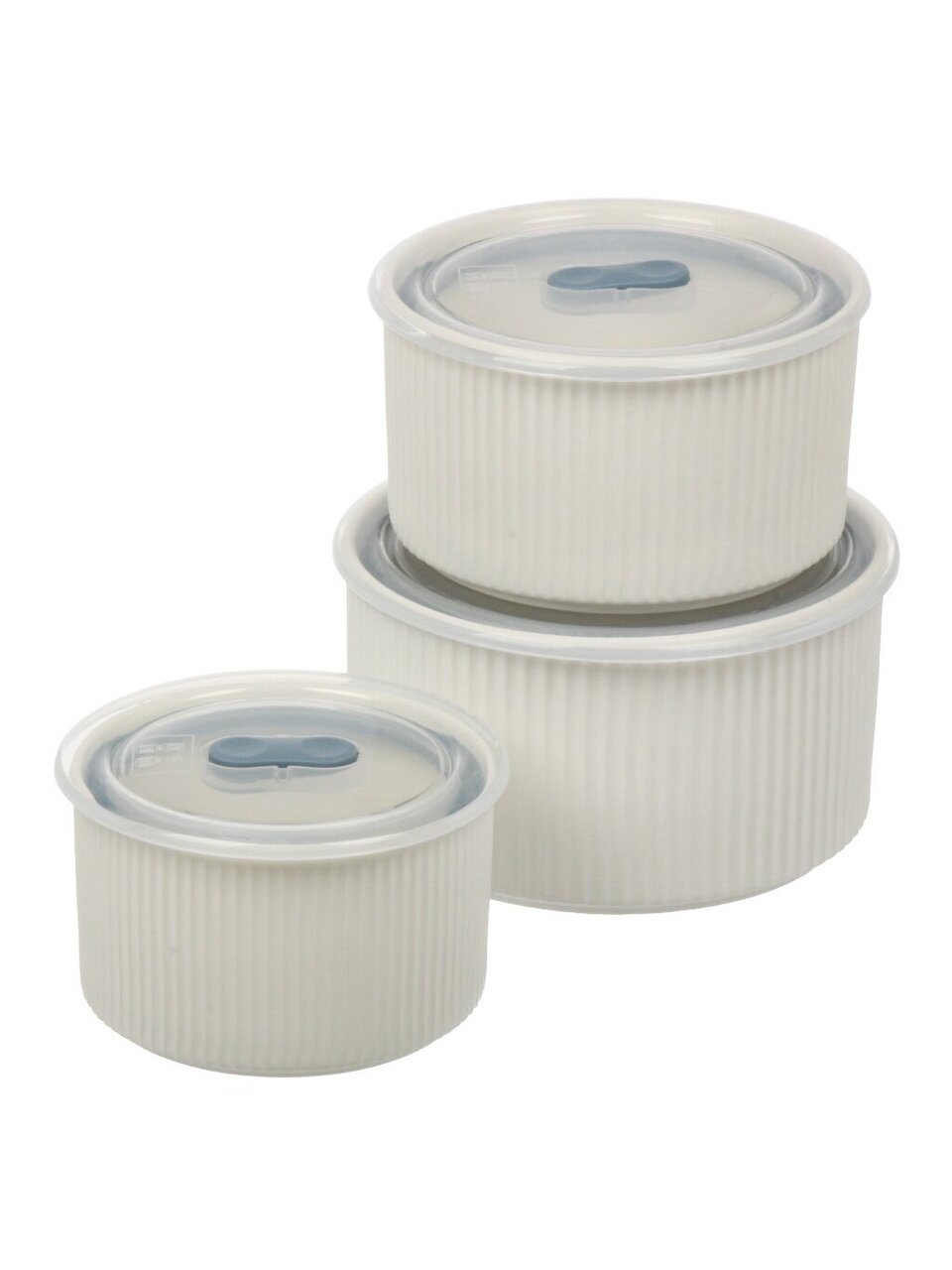 - Три салатника из керамики (17х9, 15х7.5, 12.5х7 см) с полимерными крышками — подходят для микроволновки и посудомоечной машины