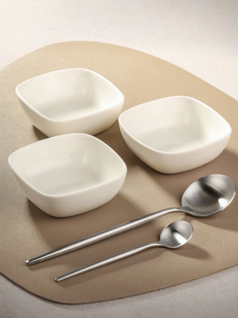 Каждый салатник имеет размеры 10 см в диаметре и 5 см в высоту. Общий вес набора — 0,6 кг. Квадратная форма обеспечивает удобство хранения.