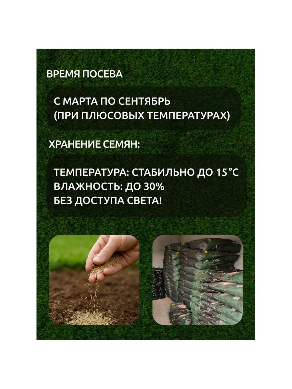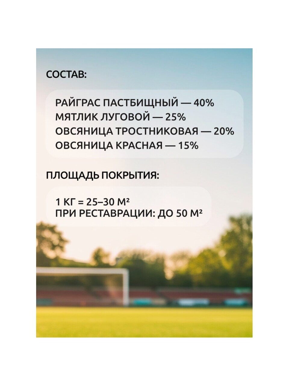 Состав продукта: 40% - райграс пастбищный, 25% - мятлик луговой, 20% - овсяница тростниковая, 15% - овсяница красная.