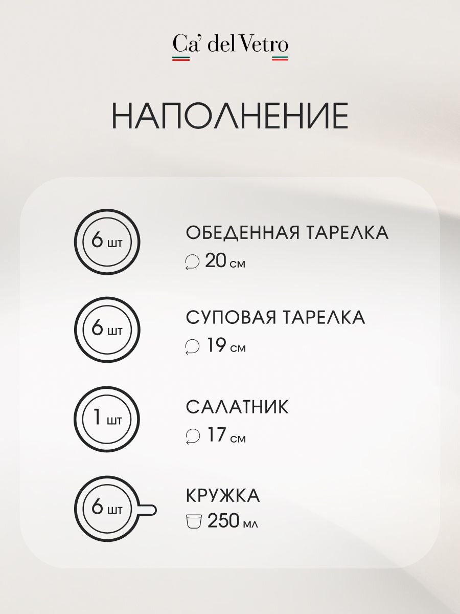 - Оптимальный комплект — 19 предметов на 6 персон, прочное стекло, подходит для СВЧ и посудомоечной машины, вес 6,8 кг