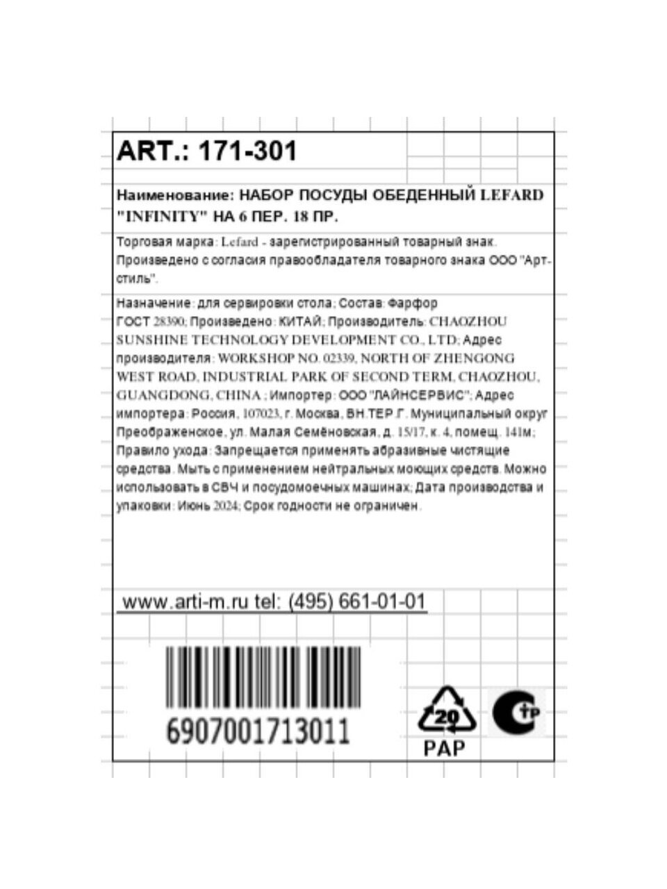 Вы можете приобрести «Сервиз столовый фарфор, 18 предметов, на 6 персон, Lefard, Infinity, 171-301, белый» и другие товары в нашем интернет-магазине в Обнинске по низким ценам и с бесплатным самовывозом.