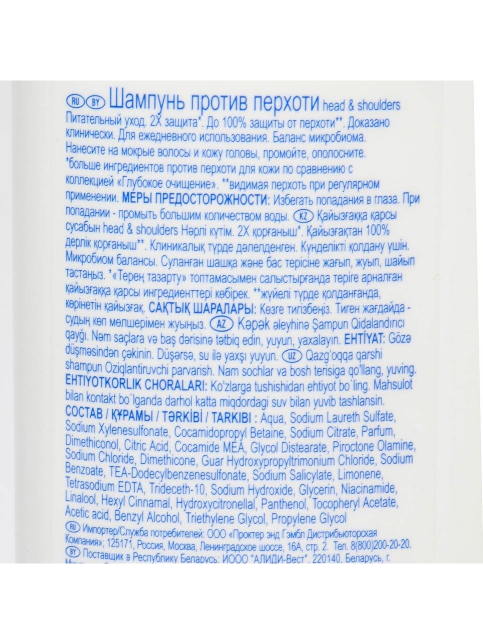 Шампунь Head & Shoulders, Питательный уход, против перх, 360 мл — эффективное средство для ежедневного ухода за волосами и кожей головы, разработанное для борьбы с перхотью и поддержания здоровья волос. Формула шампуня направлена на интенсивное питание и увлажнение, что особенно актуально для жителей России, где переменчивый климат и отопительный сезон могут негативно сказываться на состоянии волос и кожи головы. Приятная текстура и удобный объем 360 мл делают выбор шампуня Head & Shoulders оптимальным для использования в домашних условиях, а также для дачи.