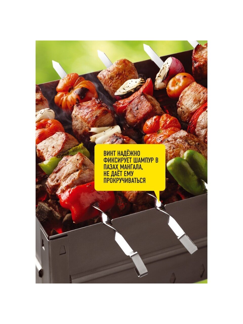 - Благодаря особой форме ручек, большие шампуры надежно фиксируются в пазах мангала и не прокручиваются.