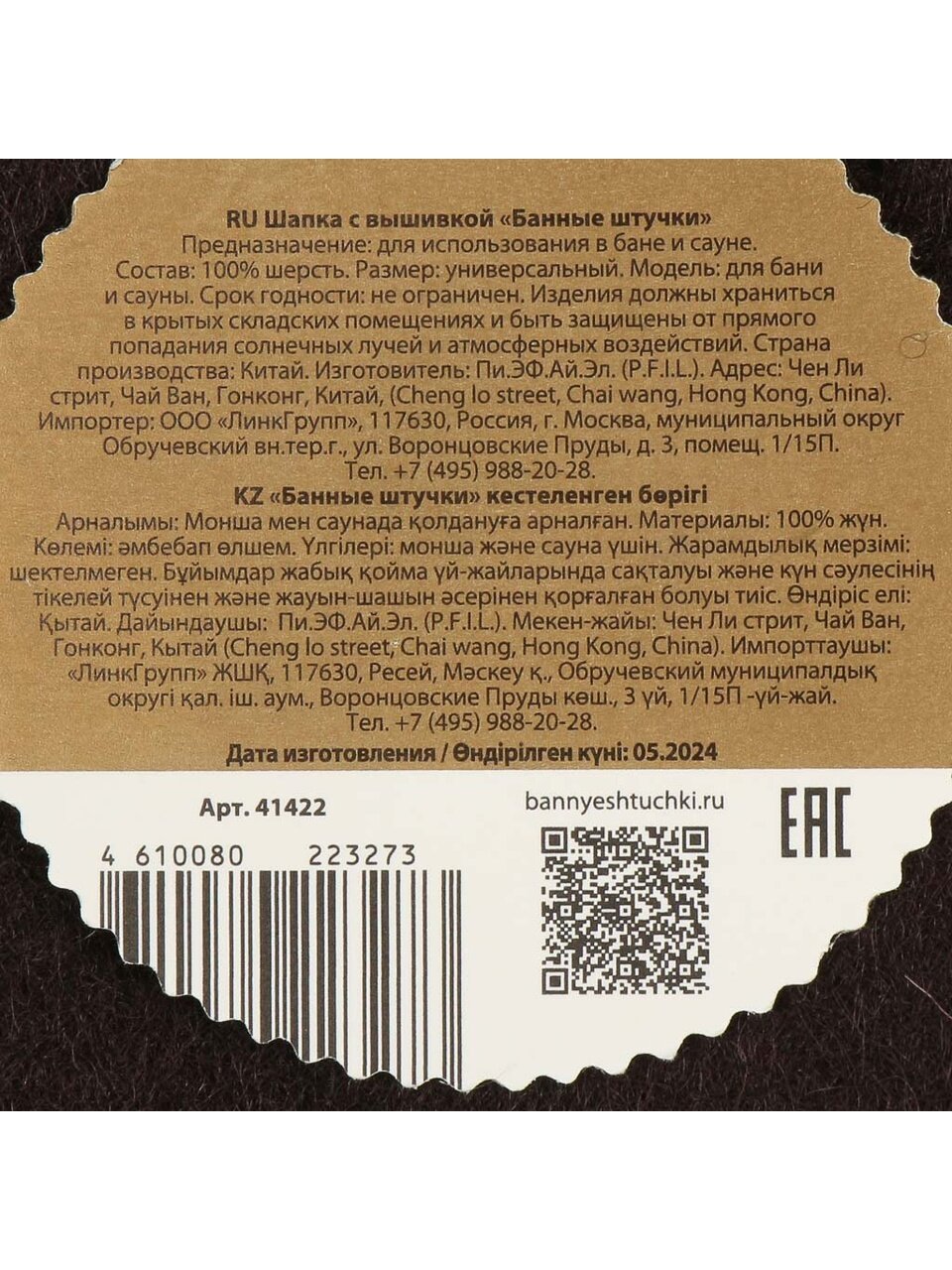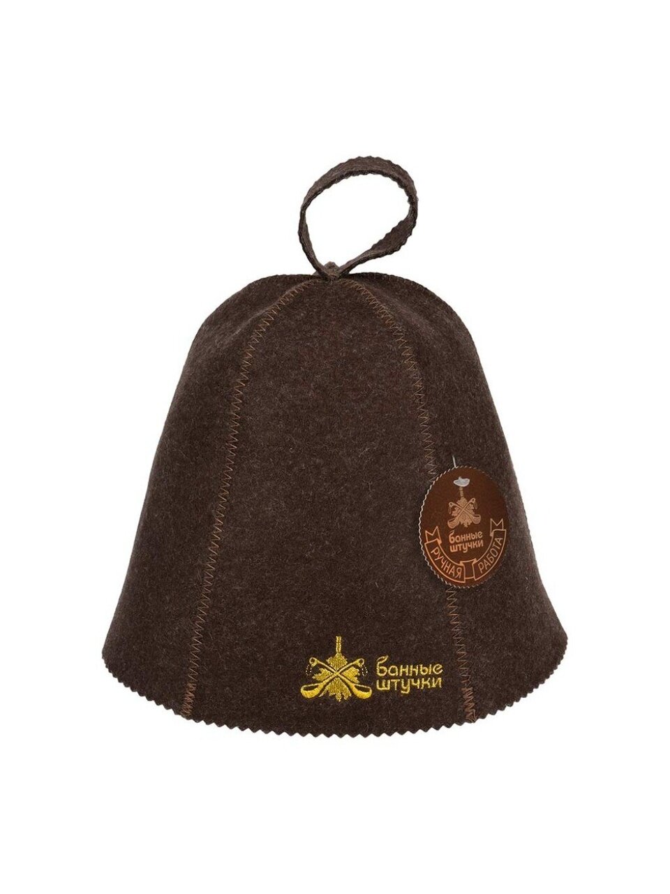 Изделие выполнено из плотного 100% войлока, цвет — коричневый, бренд — «Банные штучки», страна производства — Китай. Подходит для взрослых, не деформируется при стирке.