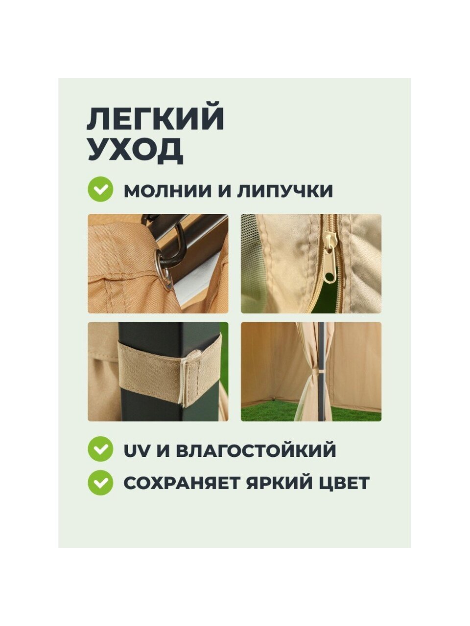 Откройте для себя идеальный способ провести время на свежем воздухе с четырехугольным шатром Green Days размером 3.21х2.56х3 м. Этот шатер сочетает в себе стильный дизайн и функциональность, обеспечивая уютное пространство для отдыха на даче или на природе. Цвет песочный, который на сайте представлен как бежевый, гармонично вписывается в любой ландшафт и создает атмосферу уюта и тепла. Двойная крыша не только добавляет элегантности, но и повышает устойчивость конструкции к ветру, обеспечивая надежную защиту от погодных условий.
